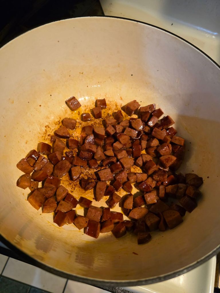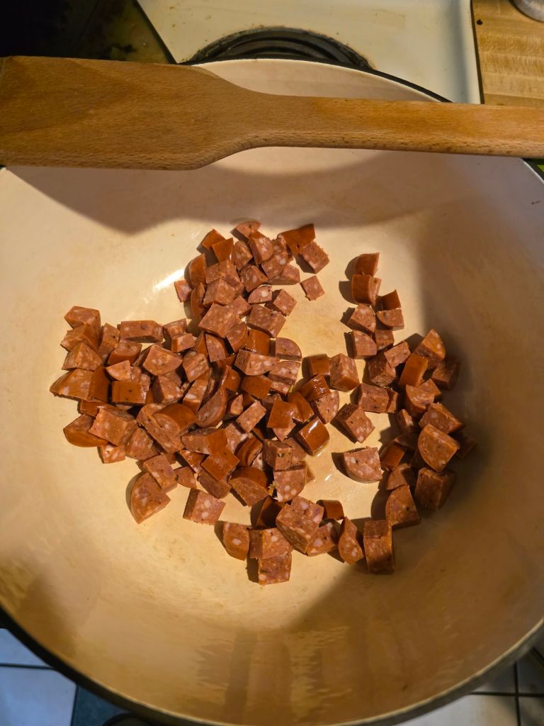 k first we gonna dice up dat sausage. cut it up pretty small unless u like large chunks in yo pasta. u do u. then hit yo pot up wit a splash of olive oil n on med heat cook yo sausage for bout 20 min or til its rendered out some fat and is hot then remove from pot n set aside