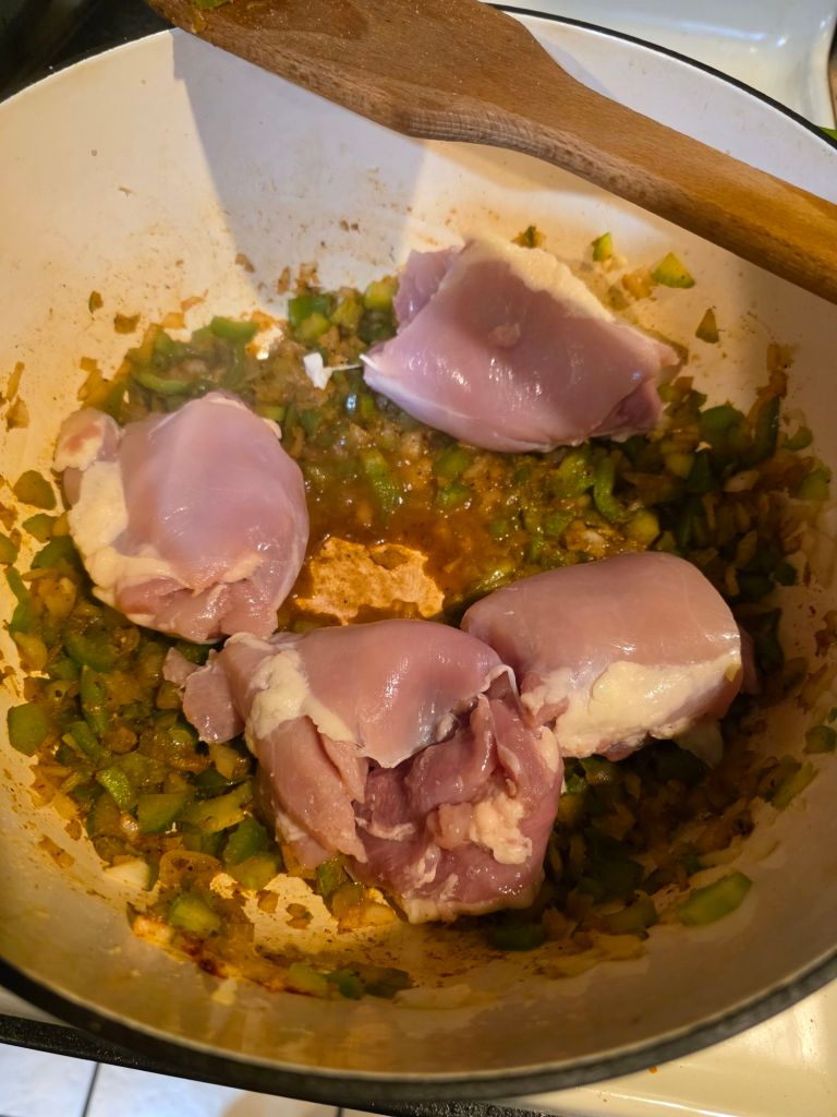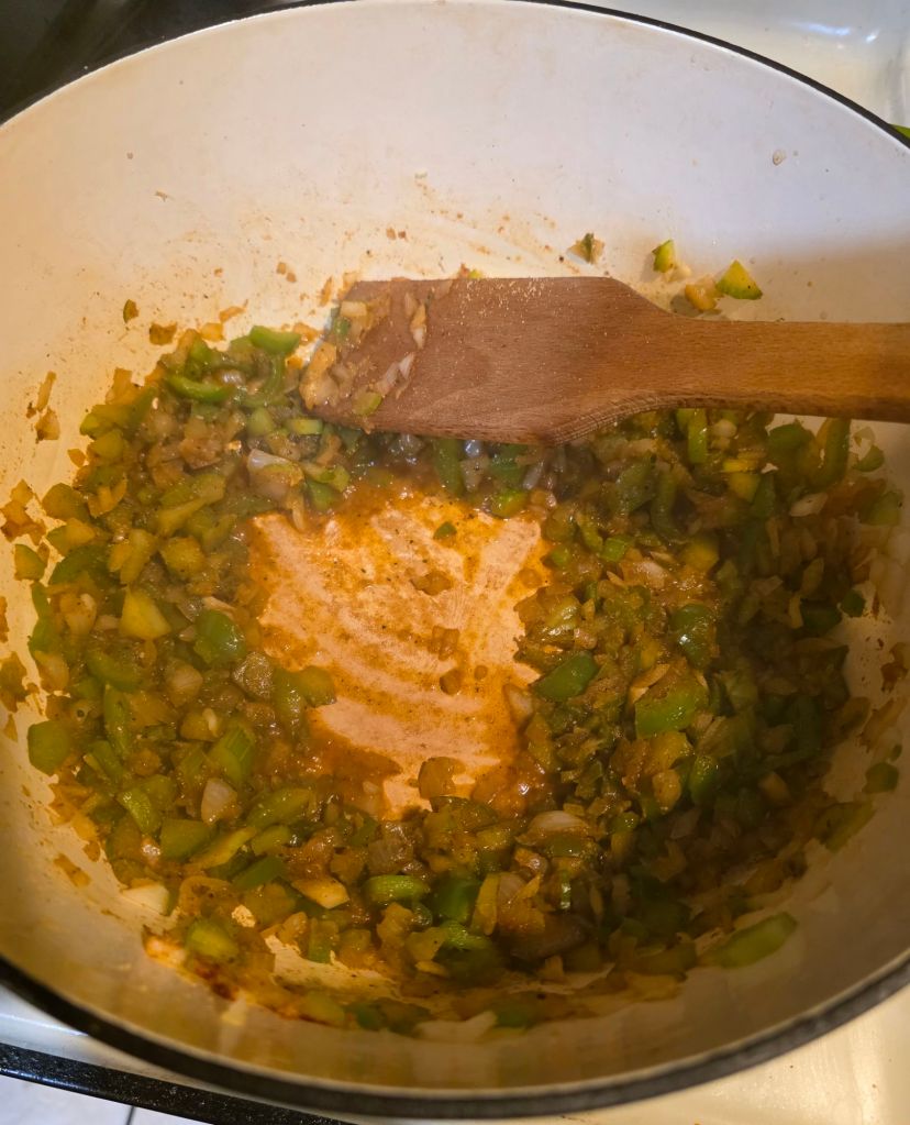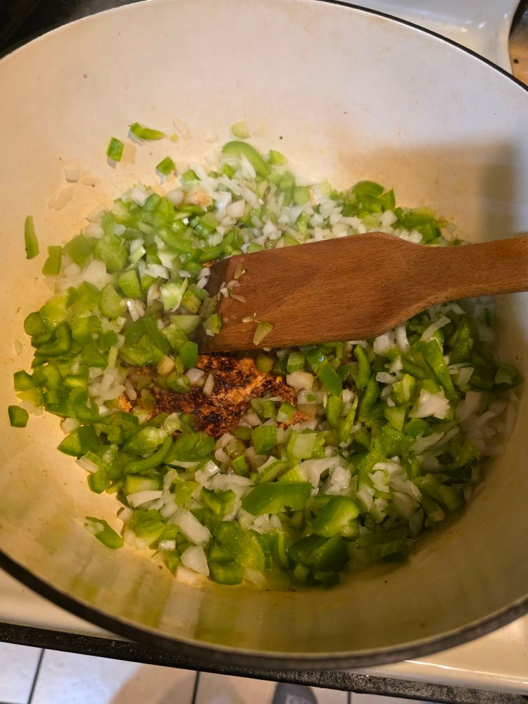 now we gonna chop up our holy trinity. da onion. bell pepper n da celery. dice it up fine n add a bit more olive oil to da pot n toss em in along with half of all our seasonings which will help soften em faster so then cook on med for bout 10 min till softish n scrape up da sausage fat at da bottom while stirring. add a spash of chic stock or water to help da scrapin n when they soften up add da jarlic ( da pope as stalekracker would say 🙏)n cook for 1 more min