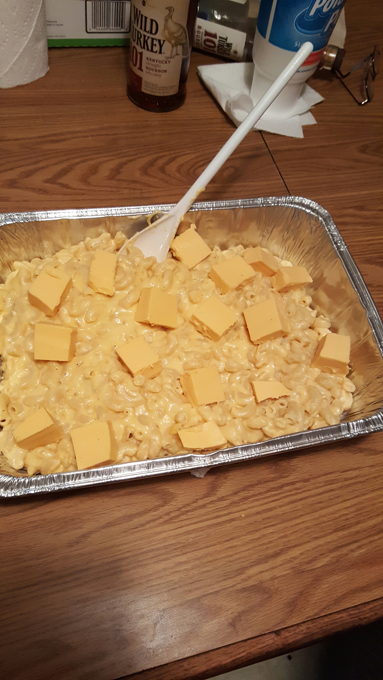 now grab da velveeta n cut it up into small cubes and lay em out all over