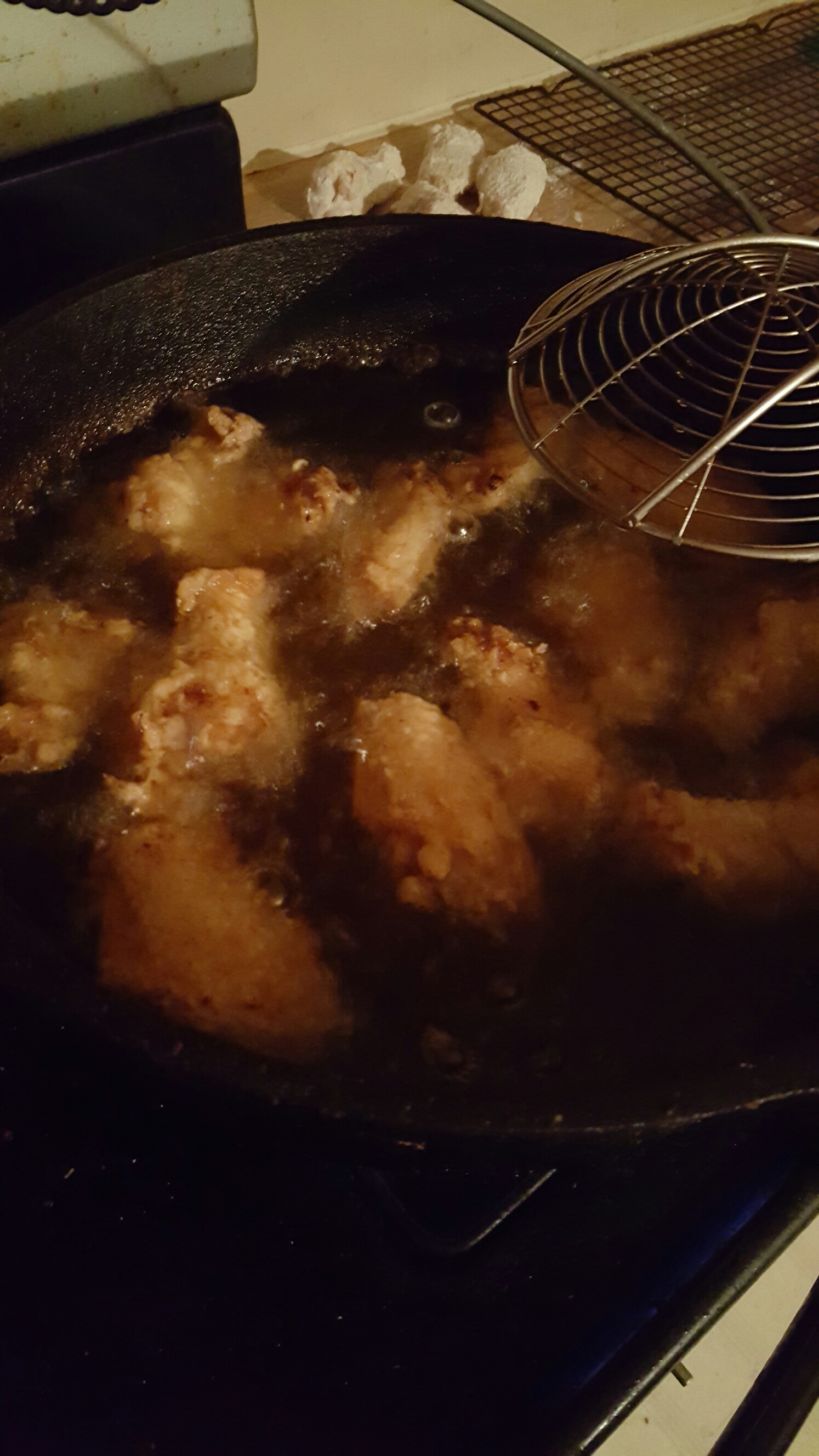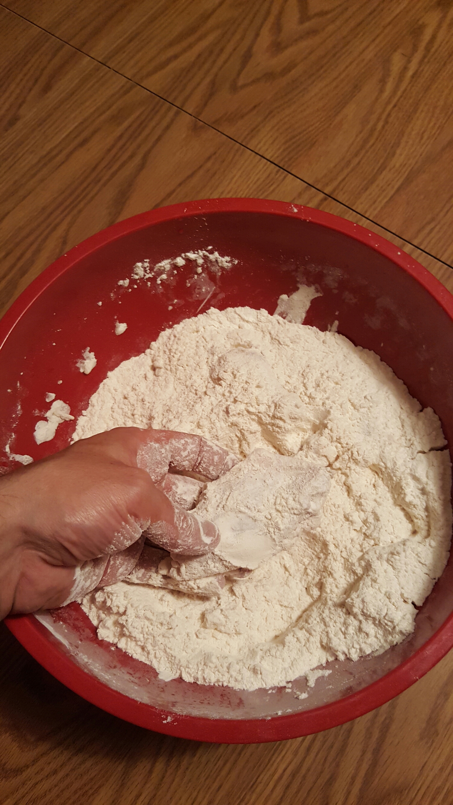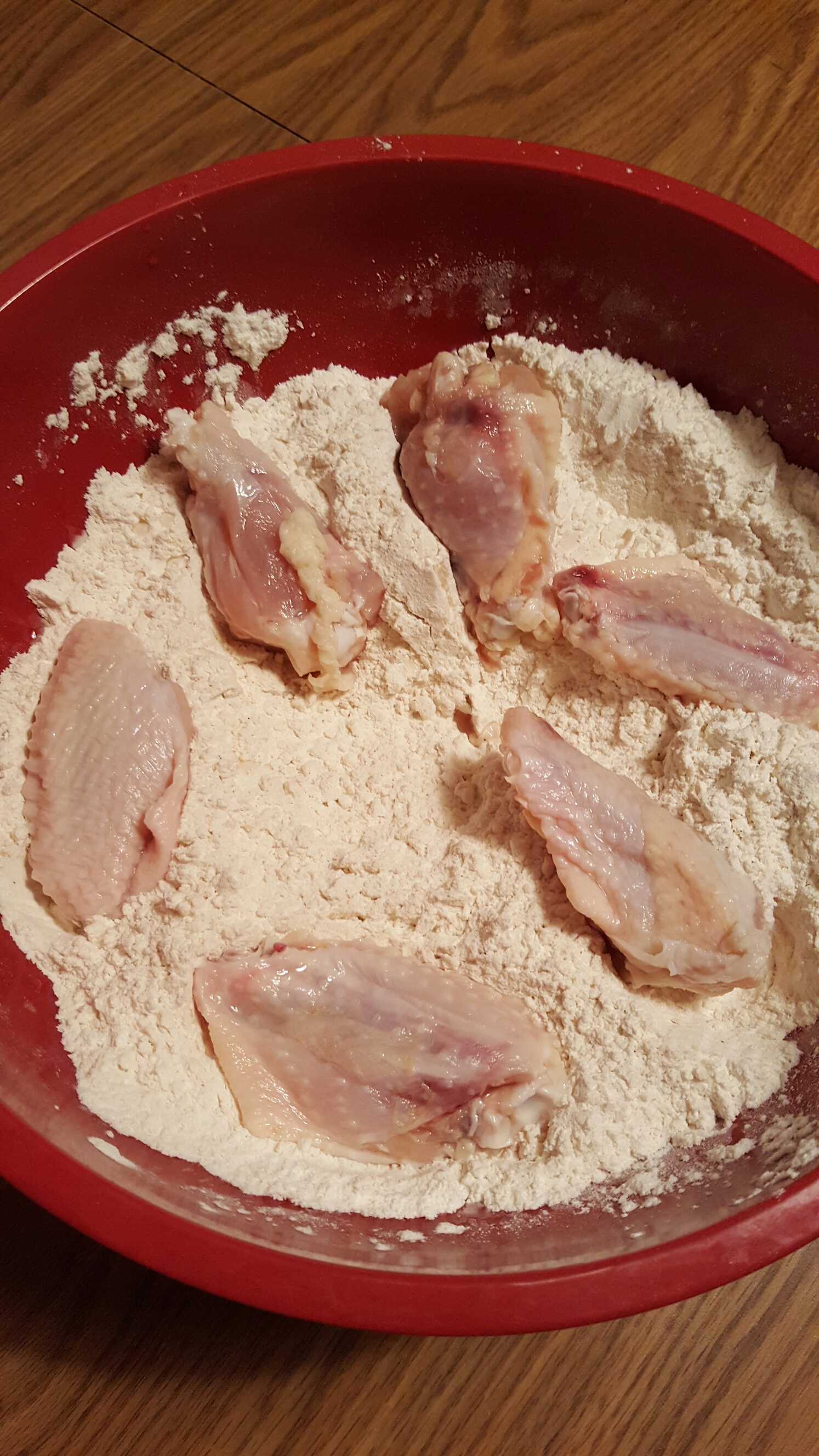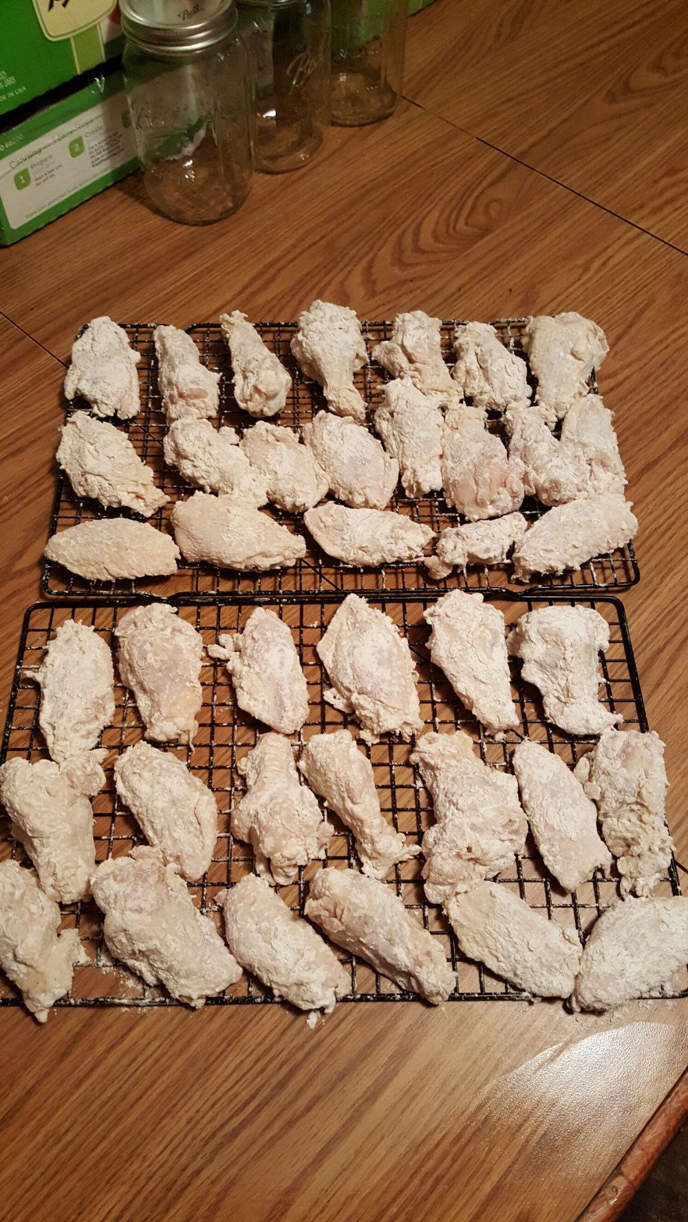 the reason i keep my left hand dry is so i dont get extra moisture in da flour mix cause itll cause alot of clumpin in there then u wont get a nice even coating and youll end up having less flour n more flour balls in your bowl lol no one likes flour ballz lol. so drop em in shake em up then use a dry hand to finish tossin em n pull em out with. after u have em all outta da flour let em rest on da racks for bout 20 min  this will allow the flour to mesh with the chicken juices n form a paste thatll stick to da chicken better while fryin then if u just tossed em in staight out da flour plus they crispier this way. and u dont need to egg wash em first before da flour  the burds are wet from the brine n dont need egg or milk. thatll cause a thicker batter n thats better off for fried chicken which ill do sum time down da road. k back at it im rantin lol burds rested n are pasty and oils at 375°  time to drop em in da oil one by one CAREFULLY lol  bout 10 to 12 at a time to not overcrowd