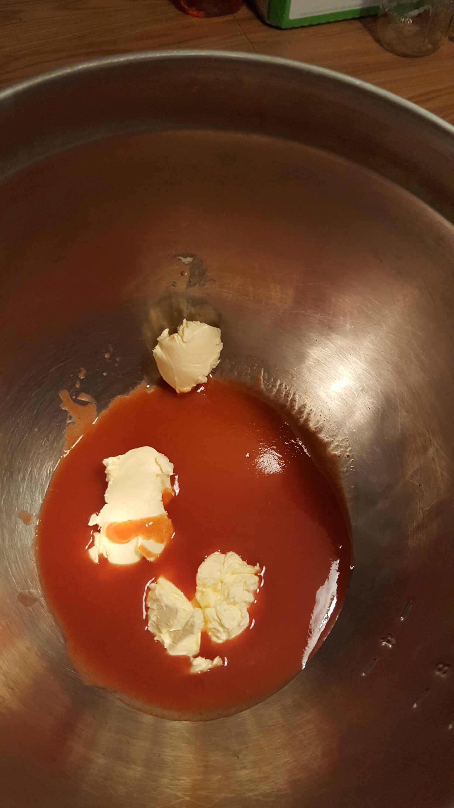 times up. pull em n place em on a cookie rack wit a paper towel under it to catch da grease n check your oil temp n make sure its back to 375° and put sum more in till there all cooked up. now lets sauce em grab bout a cup of da franks and about 1/4 cup butter and put em in a big bowl