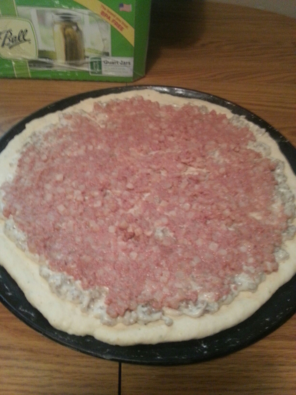 k now scramble up bout 6 to 8 eggs n spread em out on dat bad boy. if u need directions for scrambled eggs just crack yo eggs in a bowl n whisk em up good til all yokes are broke up. n take a pan over med low heat n melt a scoop of butter then add eggs n stir every min keeping any eggs from forming into a solid mass lol til u have scrambled eggs. n kill da heat right before they look done so they not dried out cause theyll keep cookin after u kill da heat n then hit em wit sum salt cause if u hit em wit salt while cookin itll break em down n make em mushy cauz they a protein duhhhhhh lol im lit