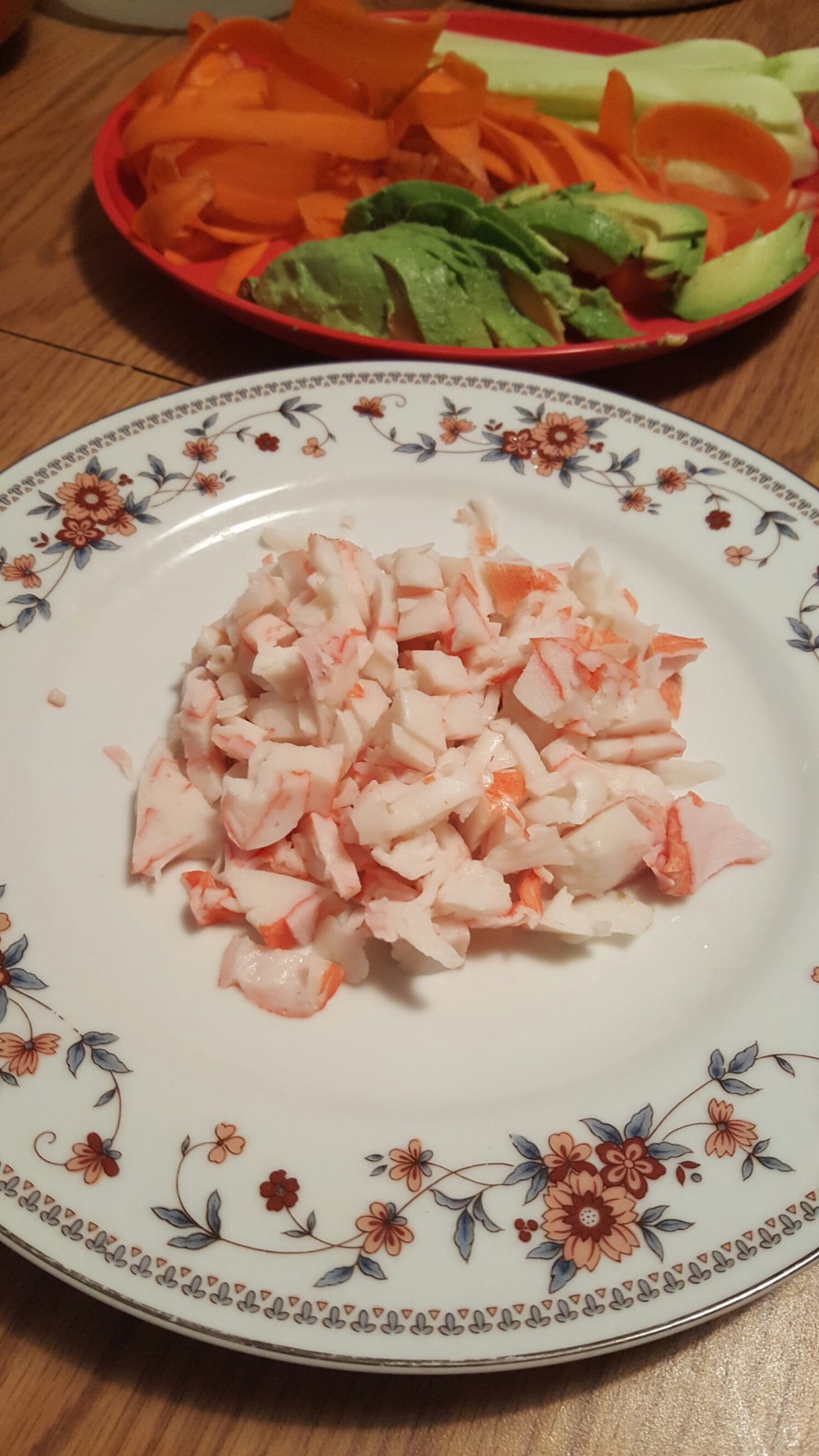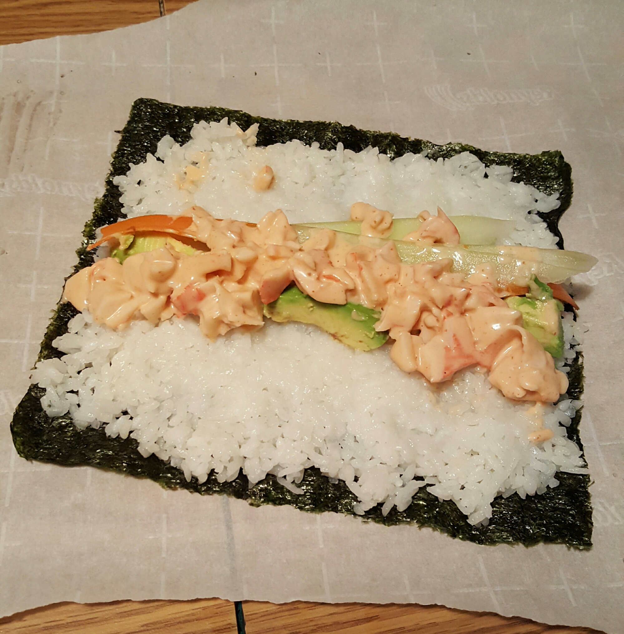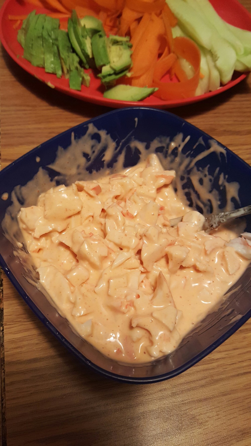 now take yo fake crab n mix it in soo good just like this but if mayo or sirrach aint yo thing theres tons of alternatives u can come up wit like having a hot dog instead or pb n j lmfao. just kiddin. but ya u can hit da crab up wit ranch or sweet n sour sauce or no sauce or terriaky. u know what i said i dont use spell check this isnt gettin graded lol. but im sure u can figure out a flavor but my boys like it like this except one n he goes plain n no sauce but da choices are endless n this is just a blueprint im sure yall can figure out different variations for this like actual raw fish n different veggies n sauce. i wanna try it wit cream cheese lol. but k im off track stupid turkey lol lets proceed