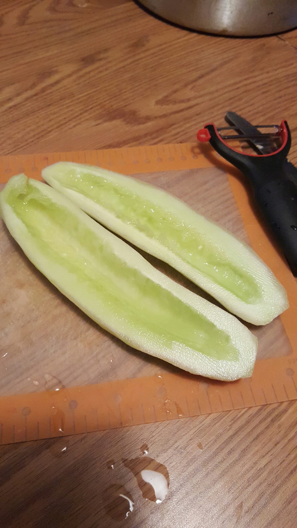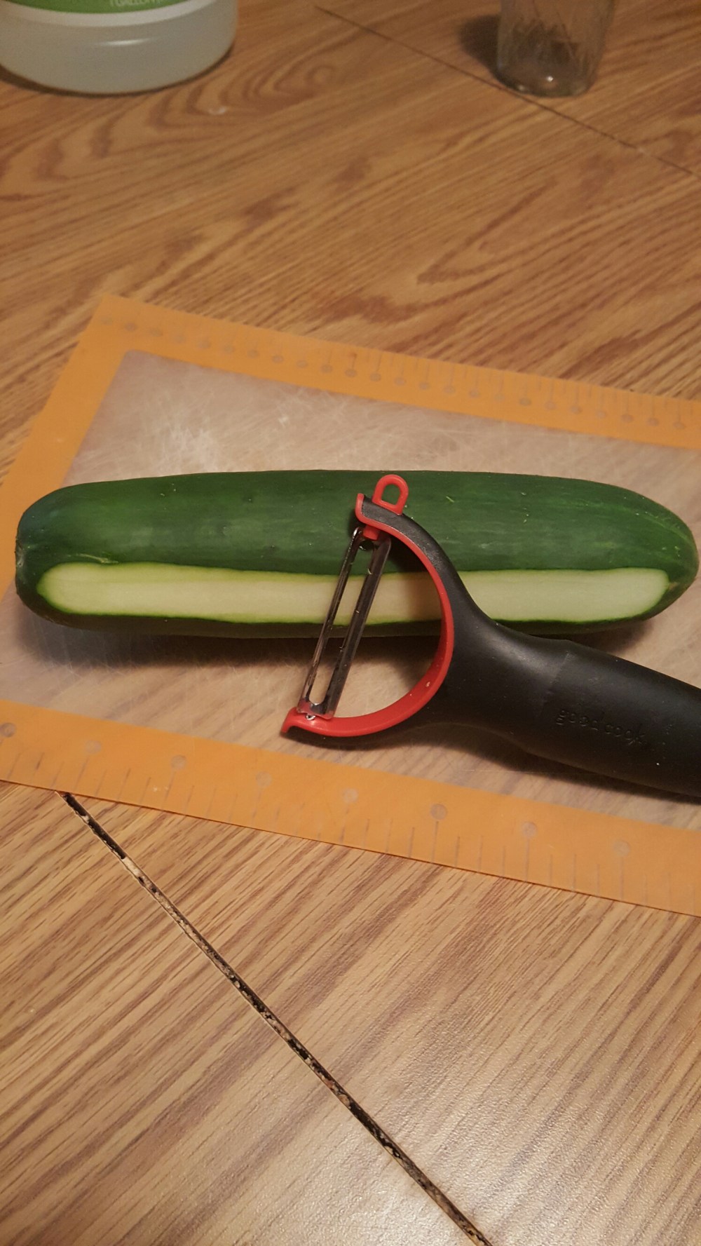 now as our rice cools down we can prep up da good stuff goin inside first well peel da rind off da cukes usin ….u guessed it a peeler. your good at this
