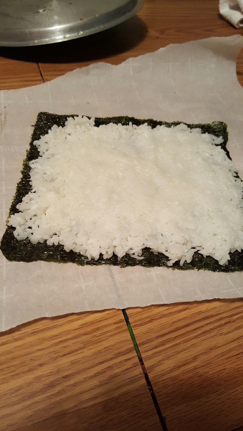 now everythings ready to assemble so lets lay our nori out on a small sheet of parchment paper that well use to roll da rrito up. y it has 2 r’s i dont know lol. n well put a thin layer of rice down on it and it helps to have a bowl of water close by to dip yo fingers in to help keep da rice from stickin to u cause we be usin our hands. i.sound like a pirate lol. arrr
