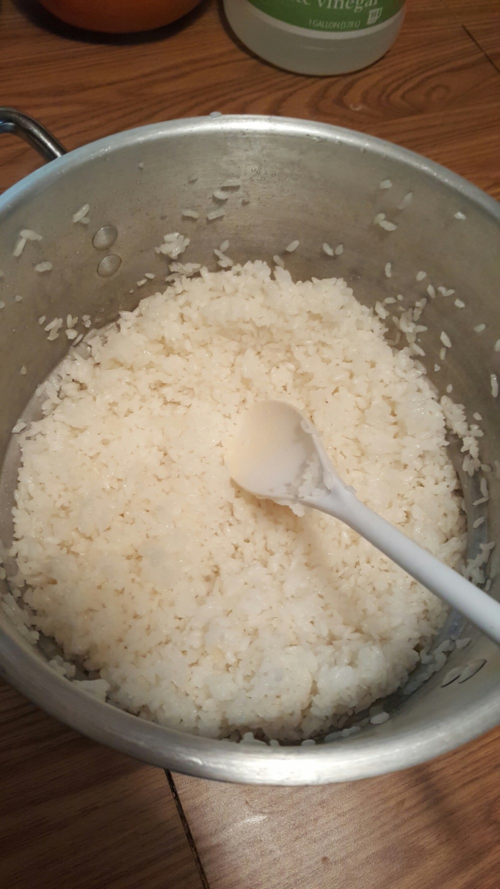now da rice is clean so well dump it into a pot n add the 3.c water n bring to a boil then cover n reduce heat to low n cook 15 min then turn off da heat n let sit covered for 10 min then well mix da vinager sugar n salt in a bowl til its all disolved n slowly add it to da rice by foldin it in so we dont mash up da rice. then well let it sit til its all cooled off n room temp n then well have our sushi rice which the word sushi means cold rice i think lol im pretty sure it dont mean raw fish but what ever im da last person who should try n have a thought lol so dont listen to me im drinkin lol