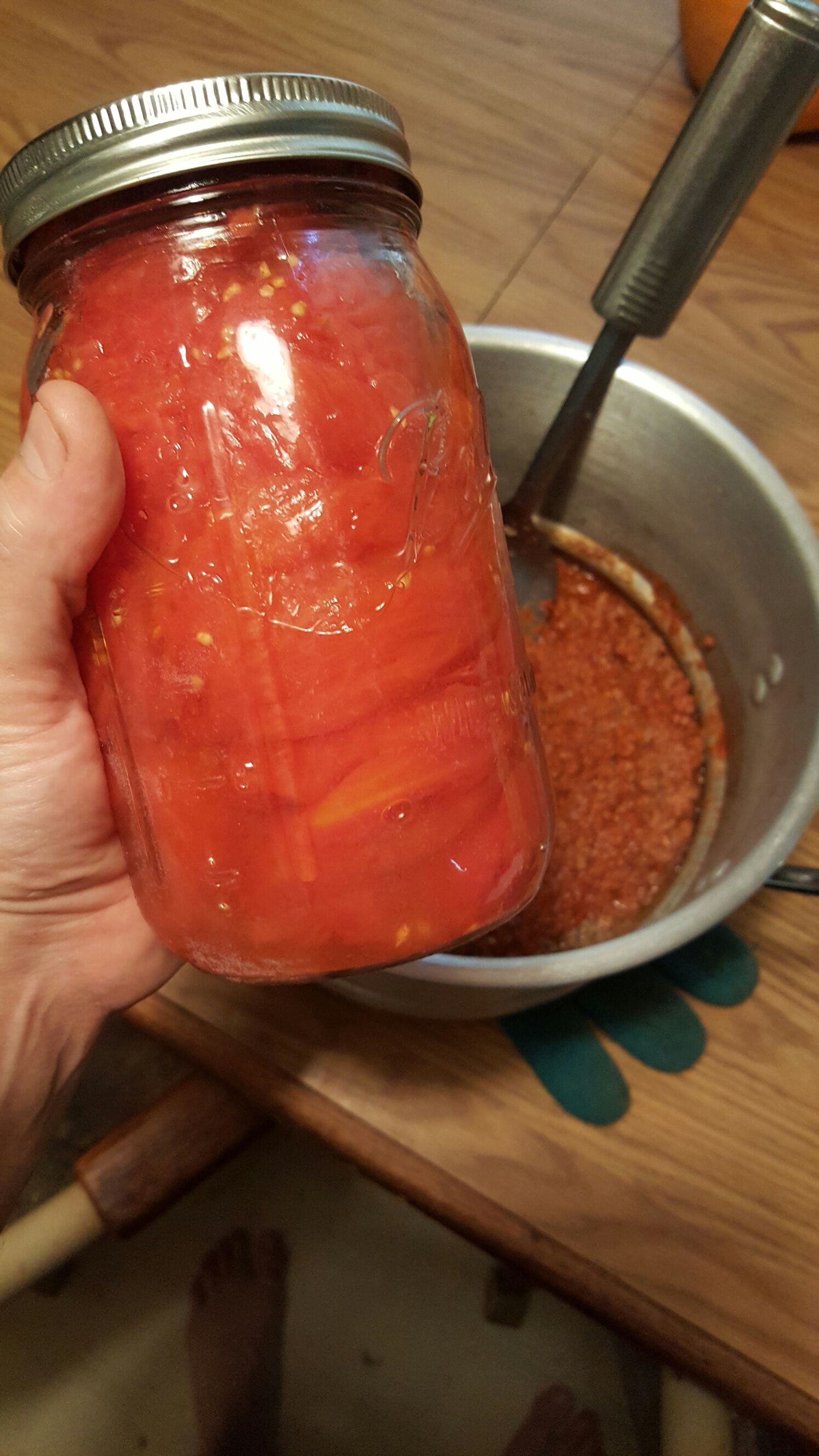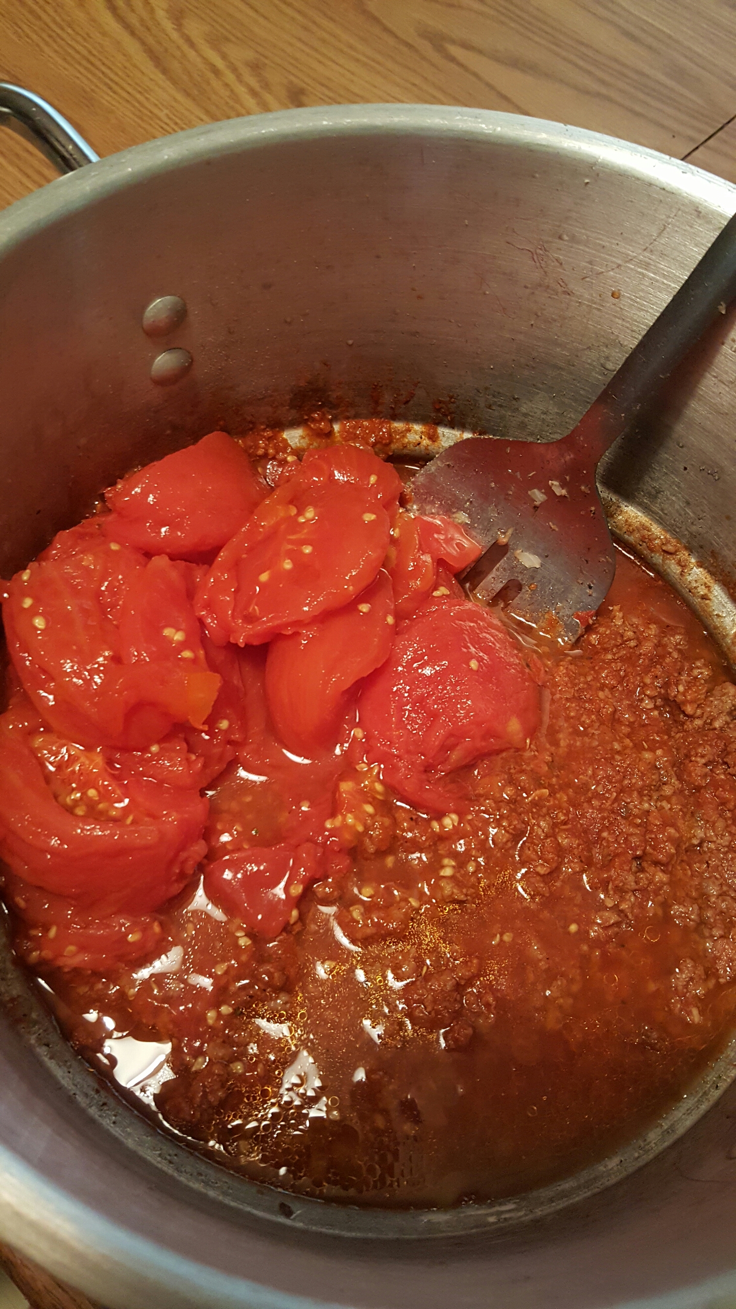 now we can add the can of crushed tomatoes and tomatoe sauces . i used sum canned tomatoes i made from moms garden since we had so many lol
