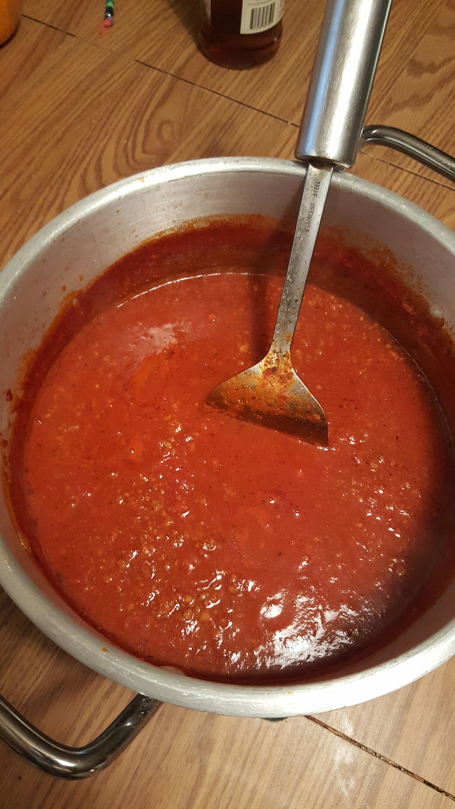 now we gonna mix em n good and turn da heat up to med high to melt up them maters lol and add our seasonings which i dont measuse so imma just kinda give u a idea of how much lol i know i know not much help but any good sauce need constant adjustments right lol. i go real heavy on the onion n garlic powder and italian seasoning. light on salt. pepper fennel and basil and only bout a 2 tbsp. sugar. unless u like a sweet sauce. i only use it to cut into da acidity from da tomatoes. and ya a splash of red wine unless u drank it all which is fine. after u got your seasoning in there keep cookin on med high constantly stirrin til it starts to bubblin up n throwin molten hot sauce all over lol at that point cut da heat to low n cover da pot most da way to allow moisture to escape but not let sauce splatter out into your face lol n simmer bout a hour or till it reduces n thickins up sum stirrin bout every 5 min or so
