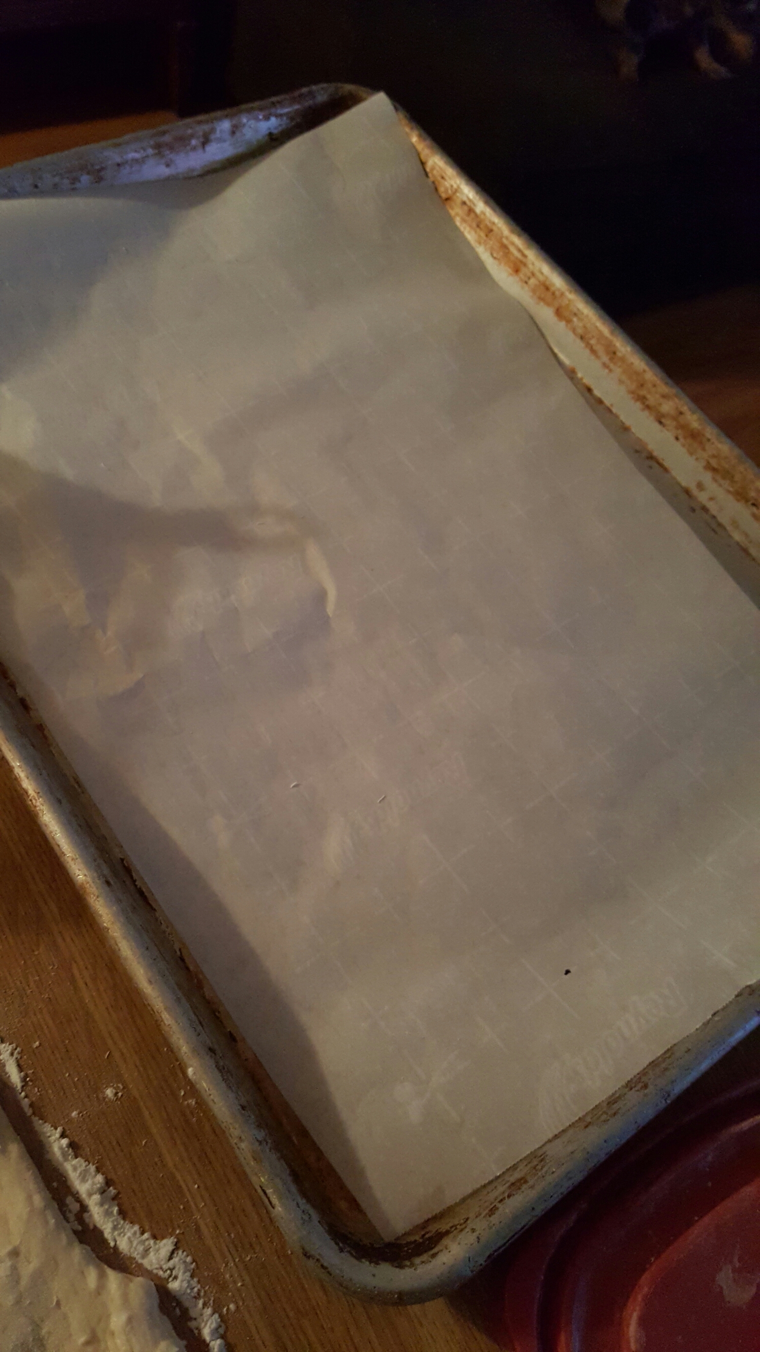 then grab u a big cookin pan sheet thing n cut parchment paper to line it. not sure y but da paper keeps anything from burnin up cause it provides a barrier between hot ass pan n dough i guess lol