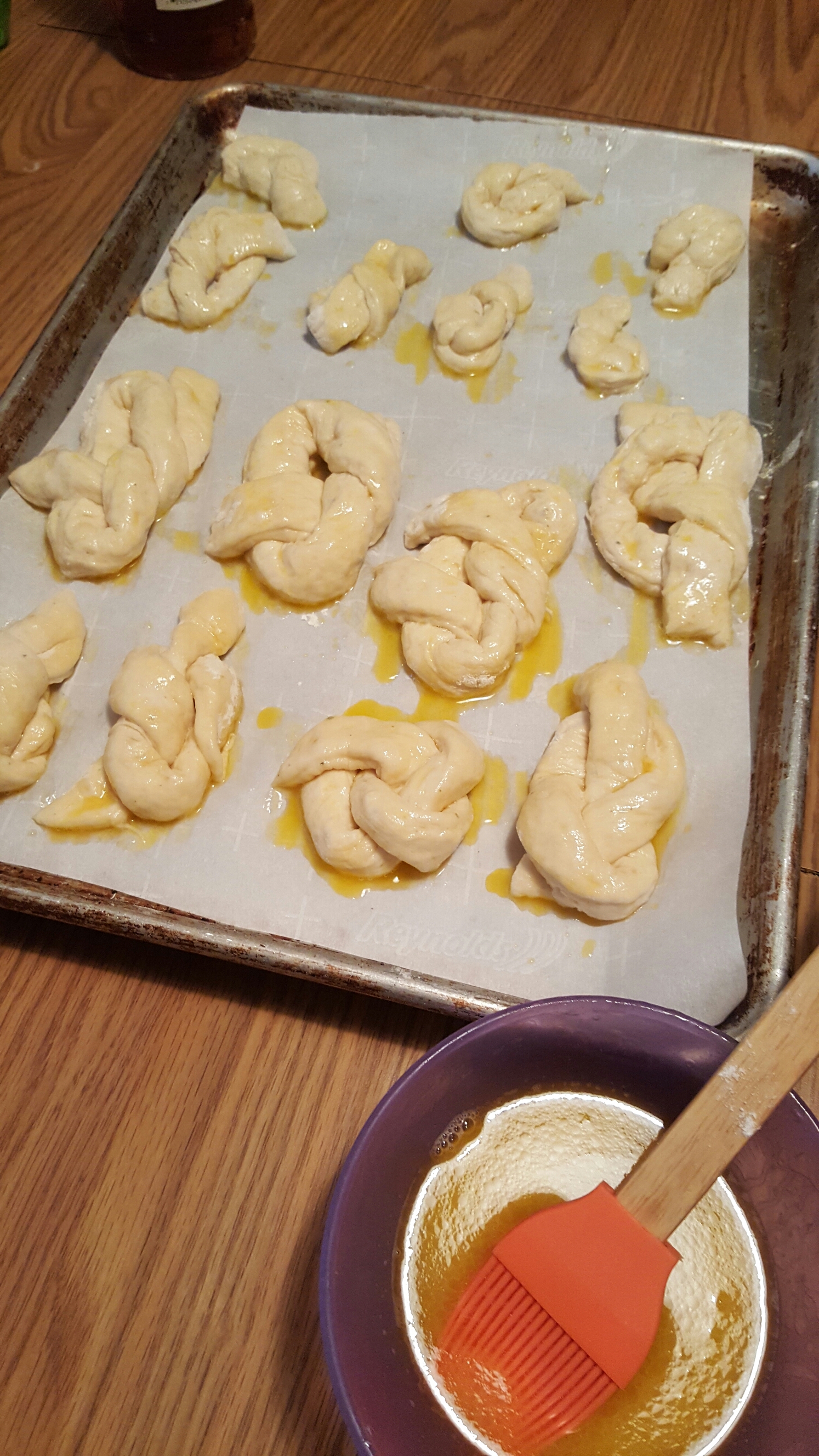 k. take them dough strips n do yo best to knot em up n place em on da sheet dont gotta be perfect sailor