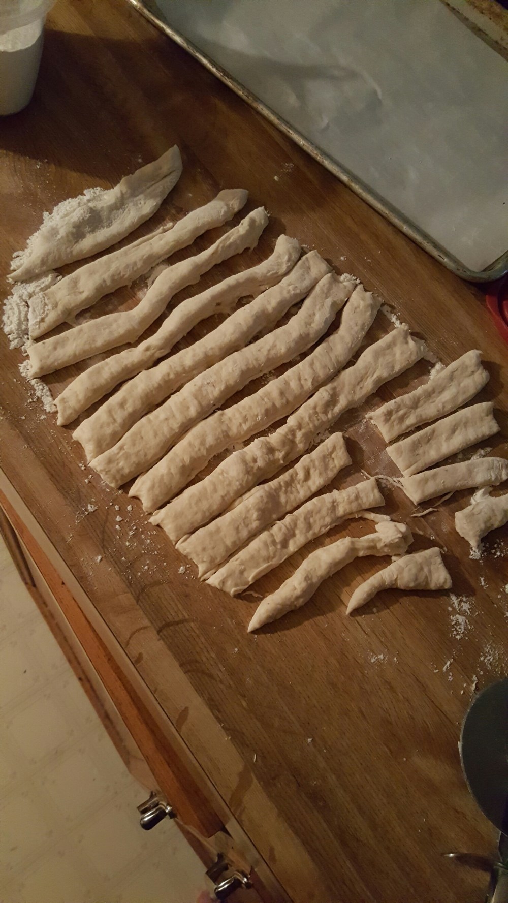 k now at this point we decide what that dough gonna be when it grows up lol. well start wit da knots by cuttin da dough wit a pizza cutter bout half to 3/4 in. wide for da cheesy stuffed sticks well go bout a inch and a half wide so for da knots it should look like this n u can even half da strips to make small knots
