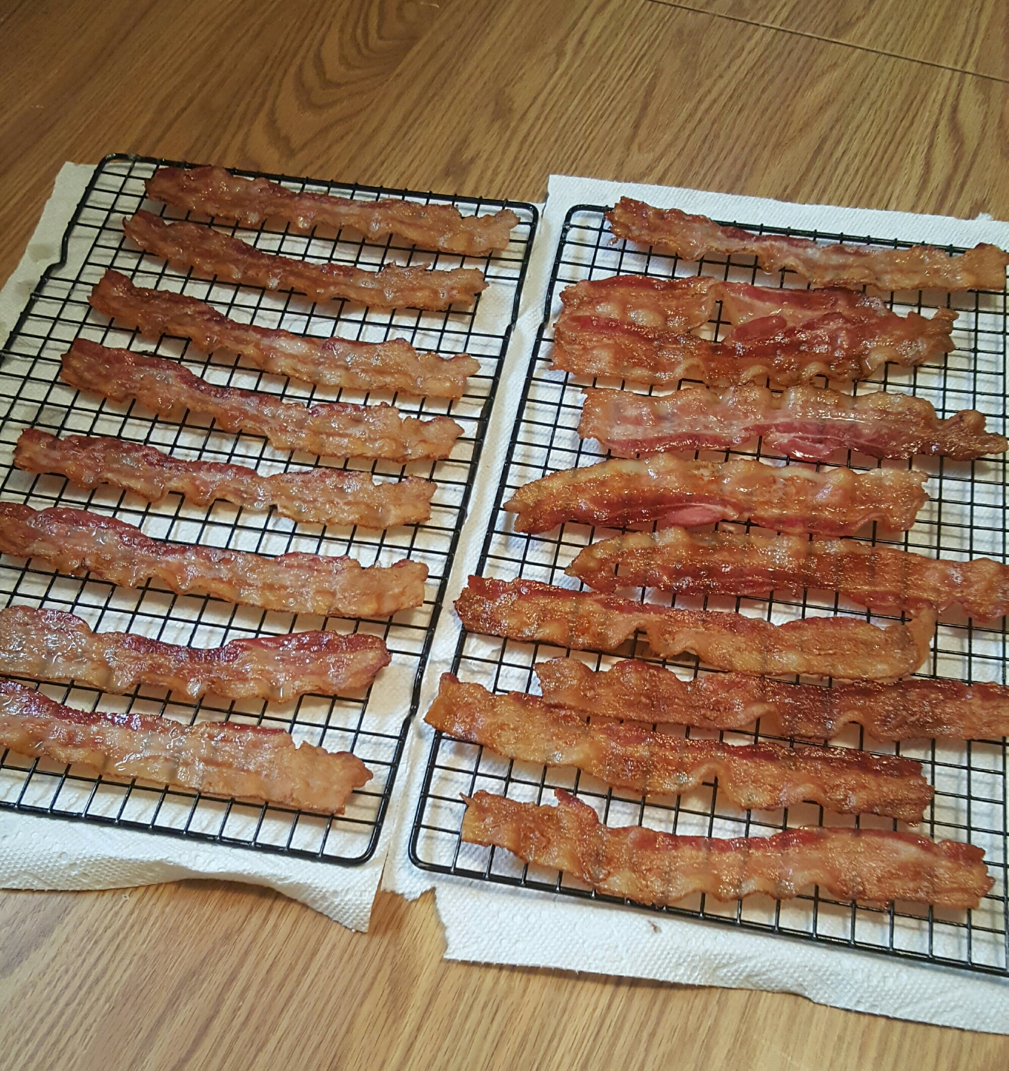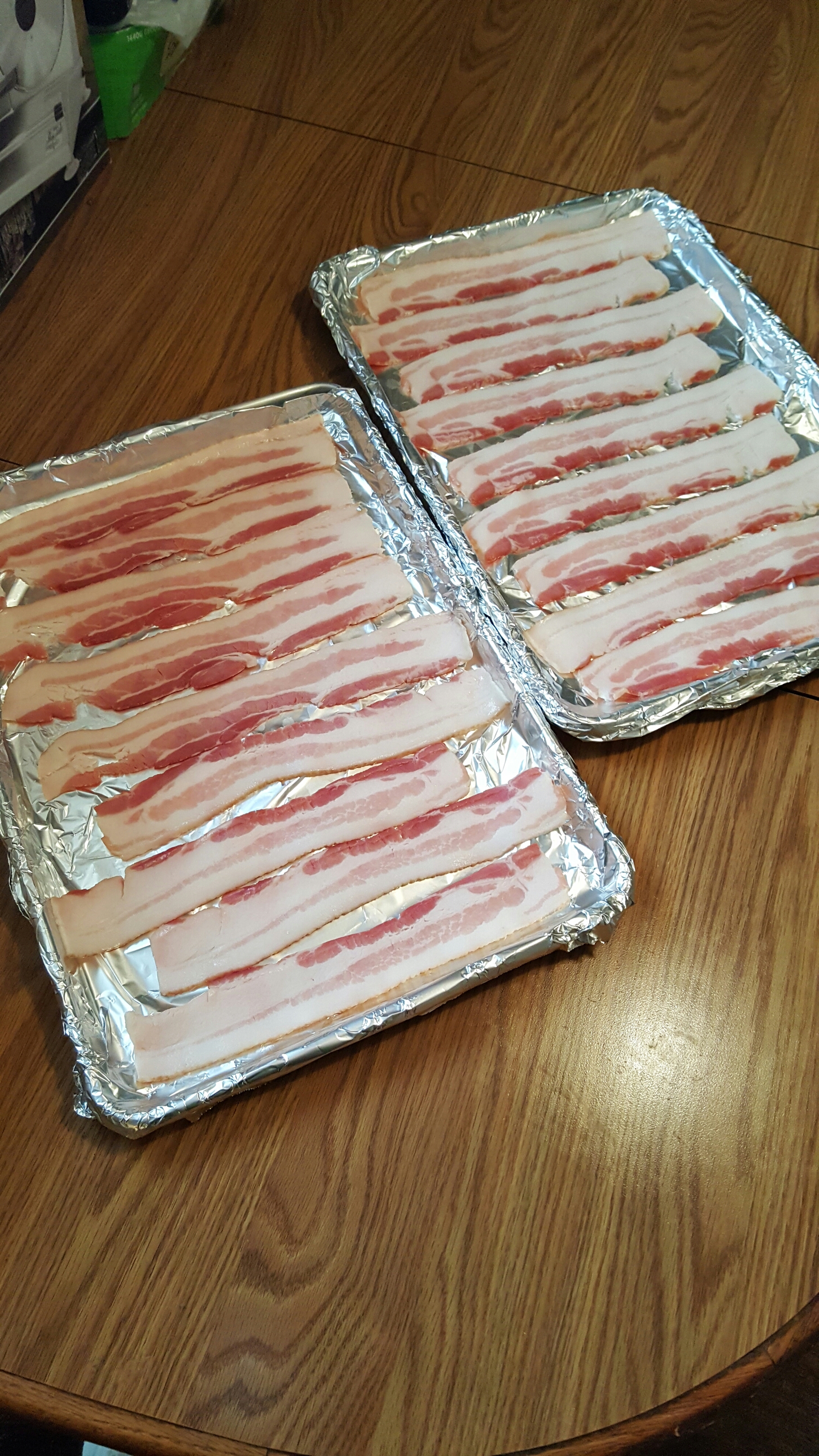 k first off get yo bacon cooked how ever u do it. i do mine in da oven as my boys know. on a foil lined pan i place em in a cold oven then set it to 410° and keep a eye on em. usually takes bout 20 min. we want em crispy