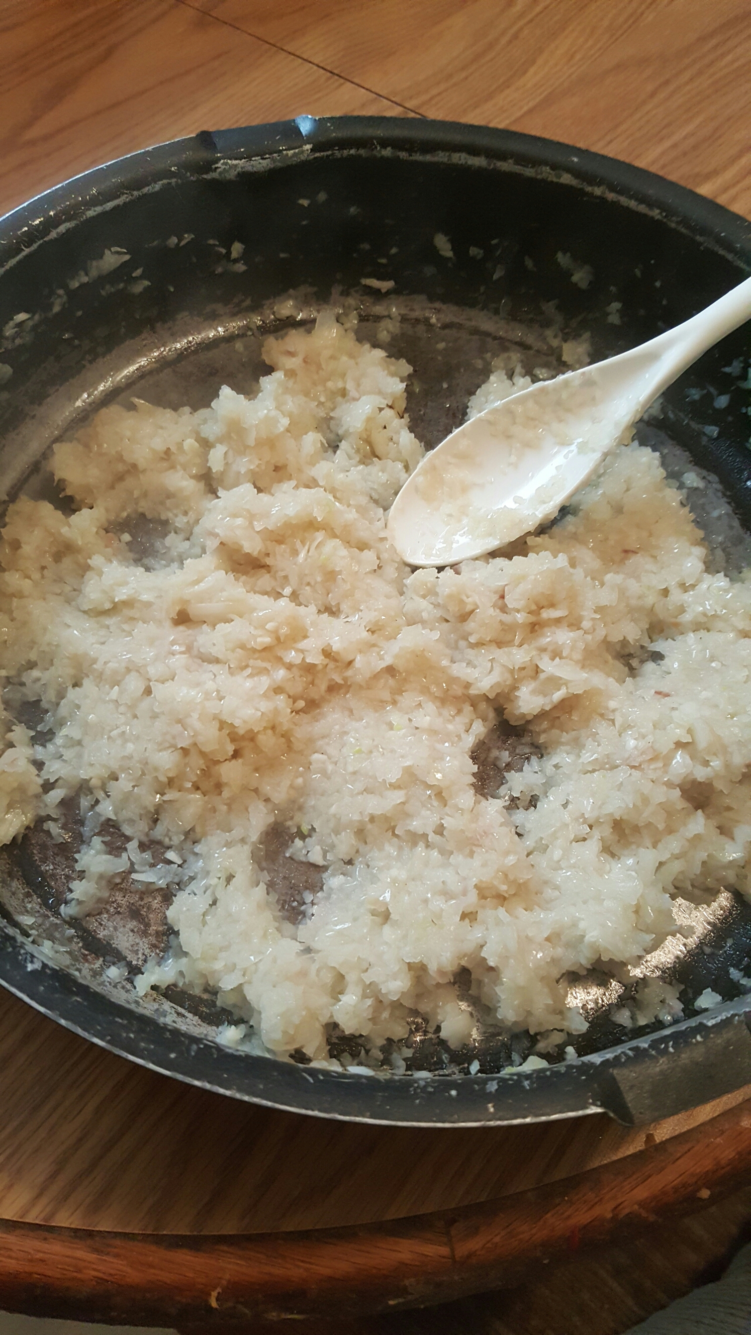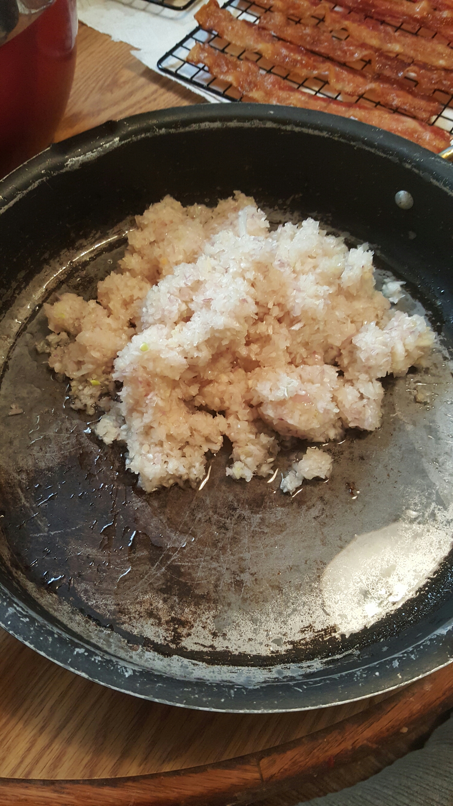 not sure whats harder not eatin all that bacon or not drinkin all da bourbon or both lol. movin on we need to get peelin and choppin da shallots n sweet onion. i just cut em up a bit n put em in da food processor for bout 6 sec. we want em diced but not mushy lol at this point if u want it hot throw your pepper of choice in wit the onions. cut em up til u get a cup of sweet and 2 cups shallots. so do em seperate. duh rite. sorry also if you are usin fresh garlic(im usin jarred cause i forgot to buy any lol) throw it in wit da onions if u want just make sure its diced up good