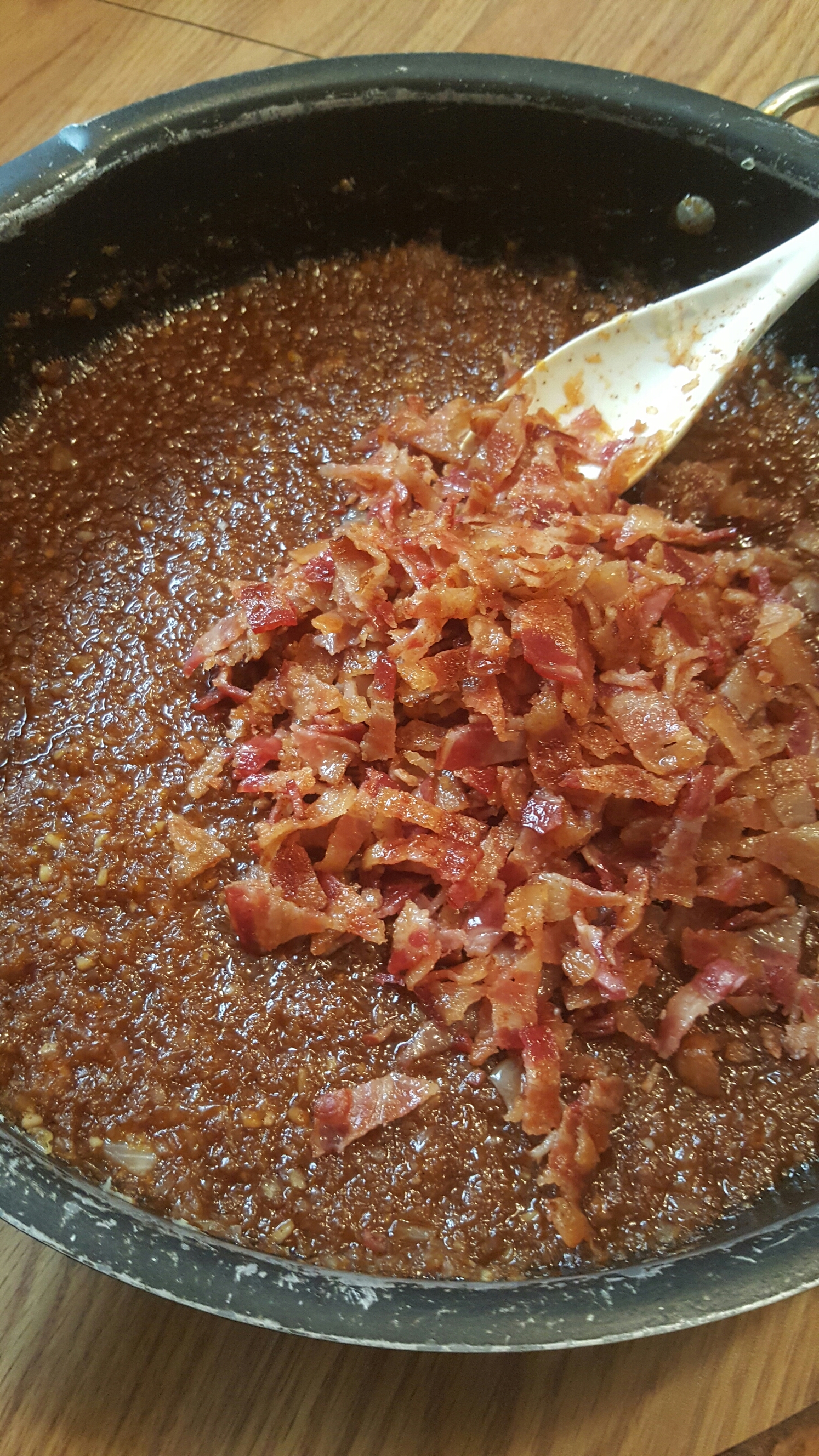 stir in da bacon real good and simmer on low for bout 20 min or til most liquid is gone and the mix is jam like