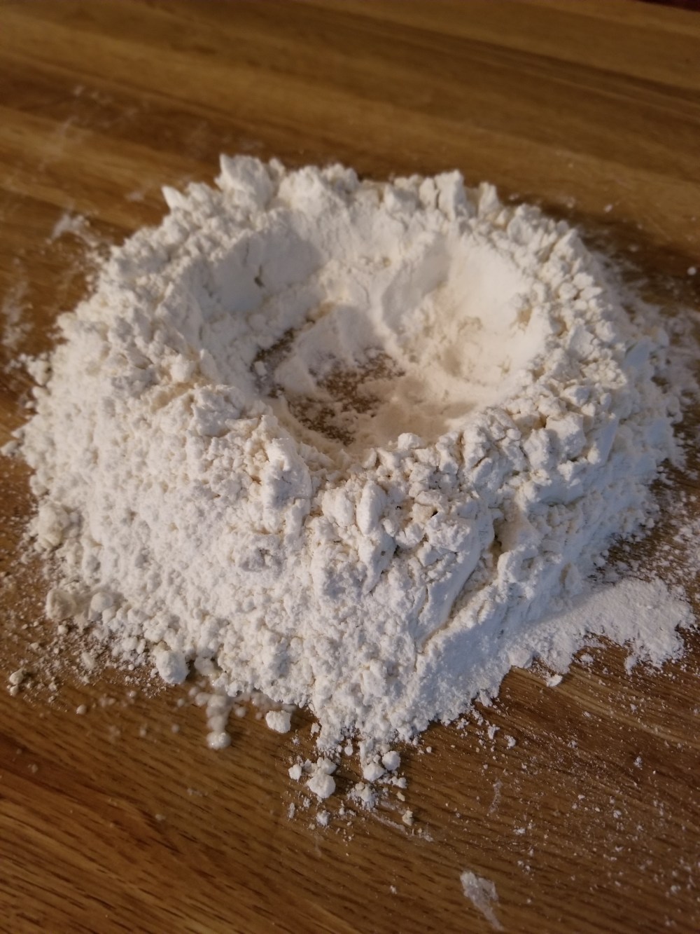 k. well start wit da pasta dough find u a clean flat spot on da table n take the 2 cups of flour n pour it down n make a wide mouthed volcano lookin form. kinda like when u dam off your mashed potatoes to make a gravy pool