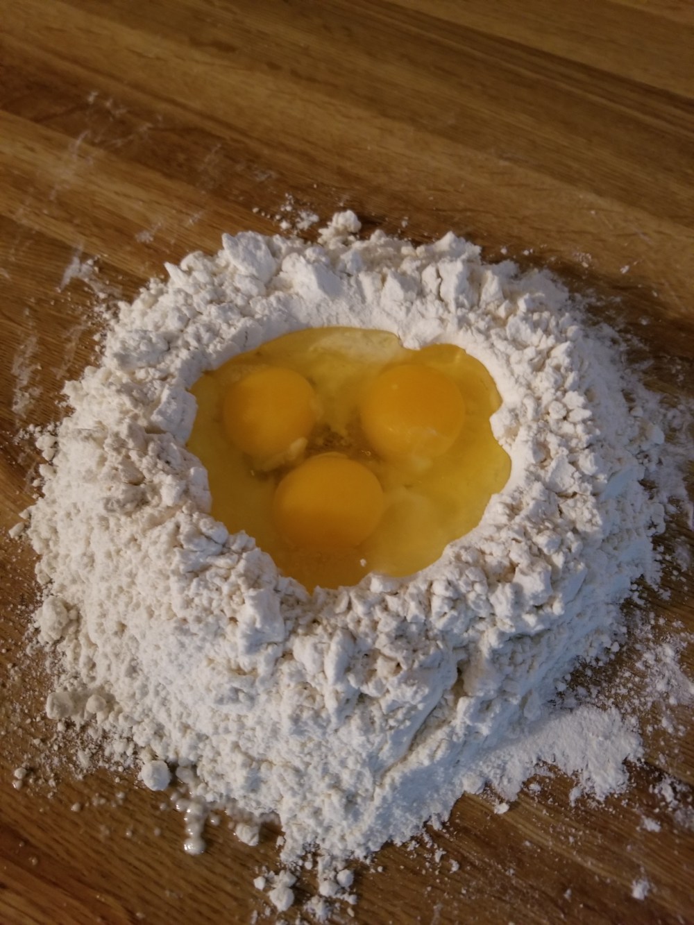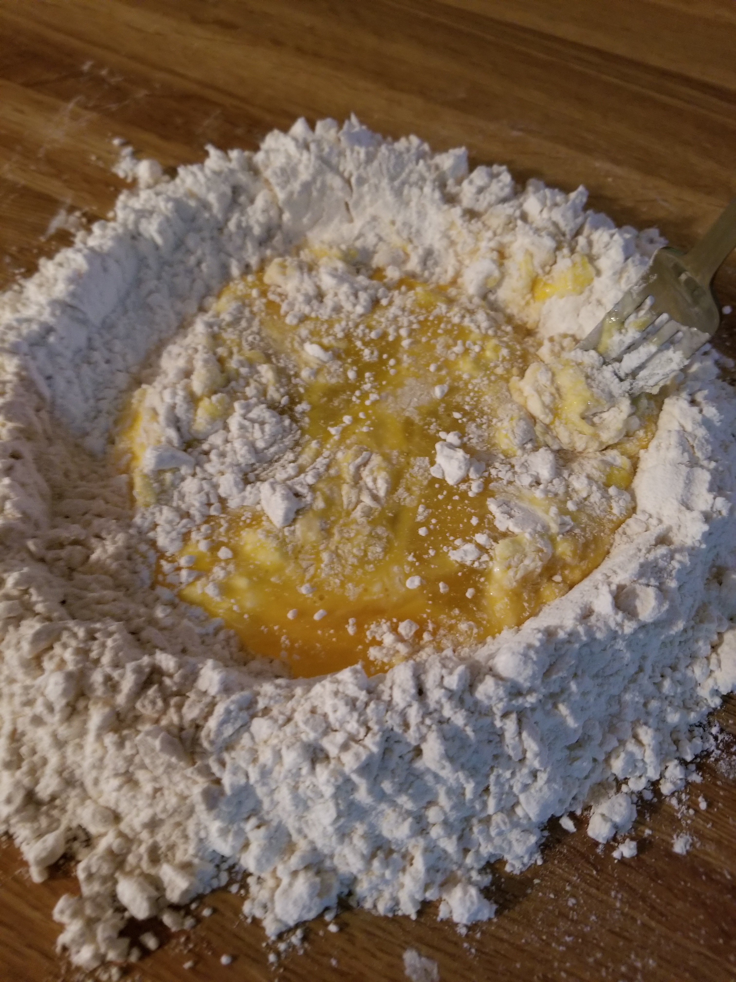 now just start slowly breakin da eggs wit a fork as u stir it outward circularly mixin bits of flour in at a time till its all pretty mixed n then get yo hands in there n knead it for a few min till its a play dough like ball. not to dry n not too sticky u can add a bit of water or more flour to adjust it either way but hold off til u kneaded for awhile cause it usually comes out rite unless u using small eggs or didnt measure yo flour rite lol oh n u can mix all this n a bowl. its just mo fun like dis lol