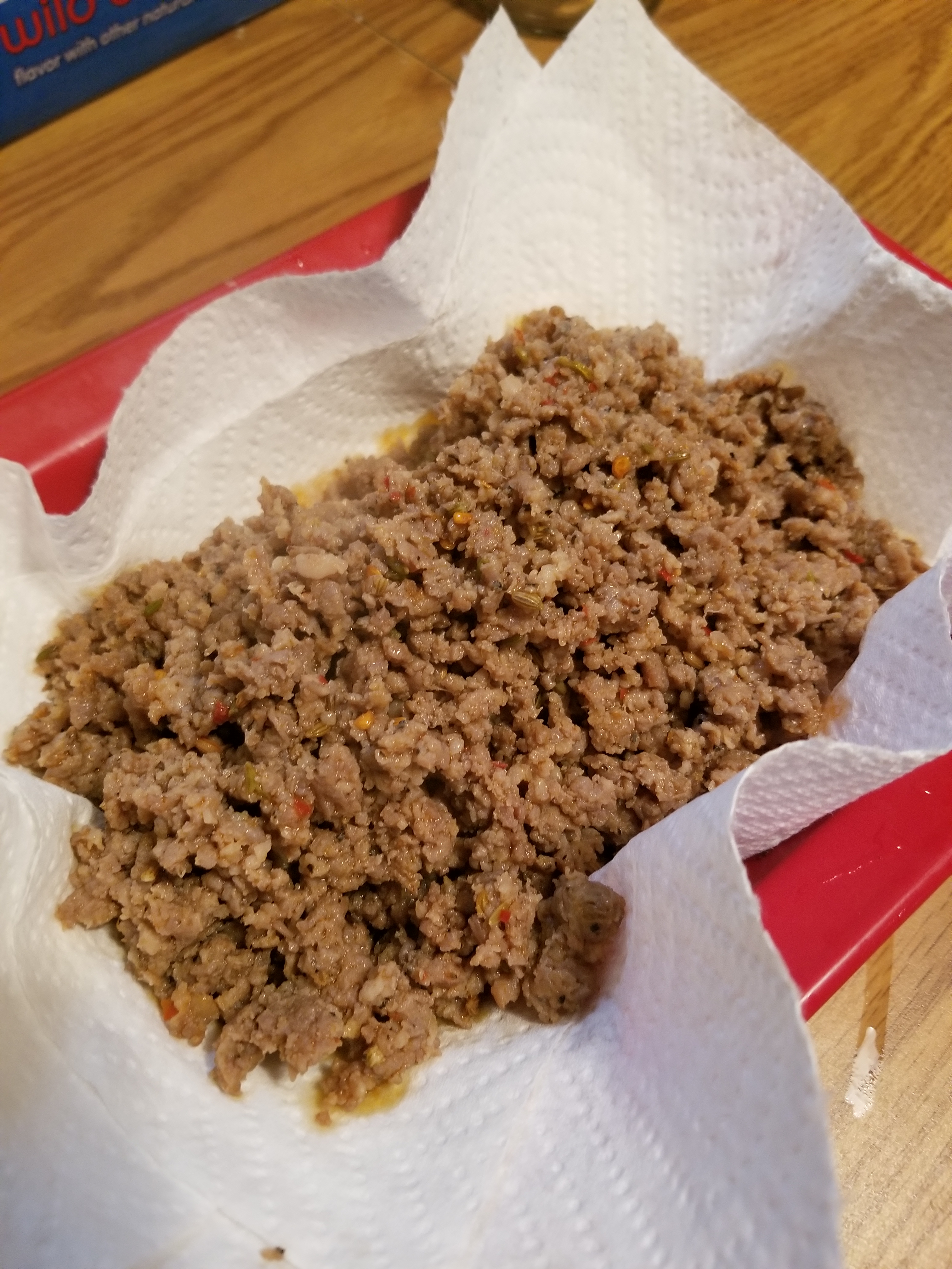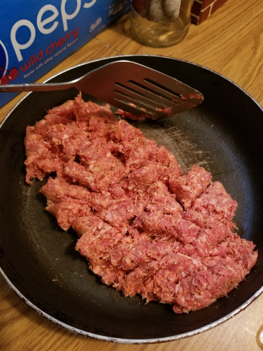 now while my dough balls are restin well get on da fillins startin wit da meat. grab your sausage. uhhh. lol. just brown the italian sausage in a pan wit your minced garlic n when its cooked all da way let it rest on a paper towel to drain off sum grease