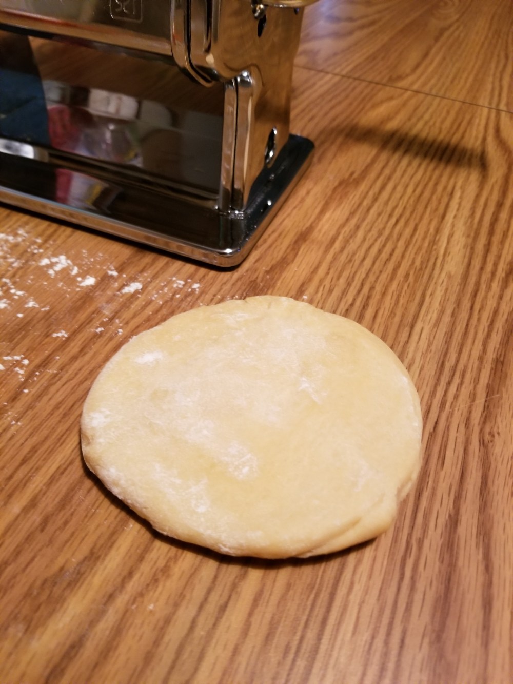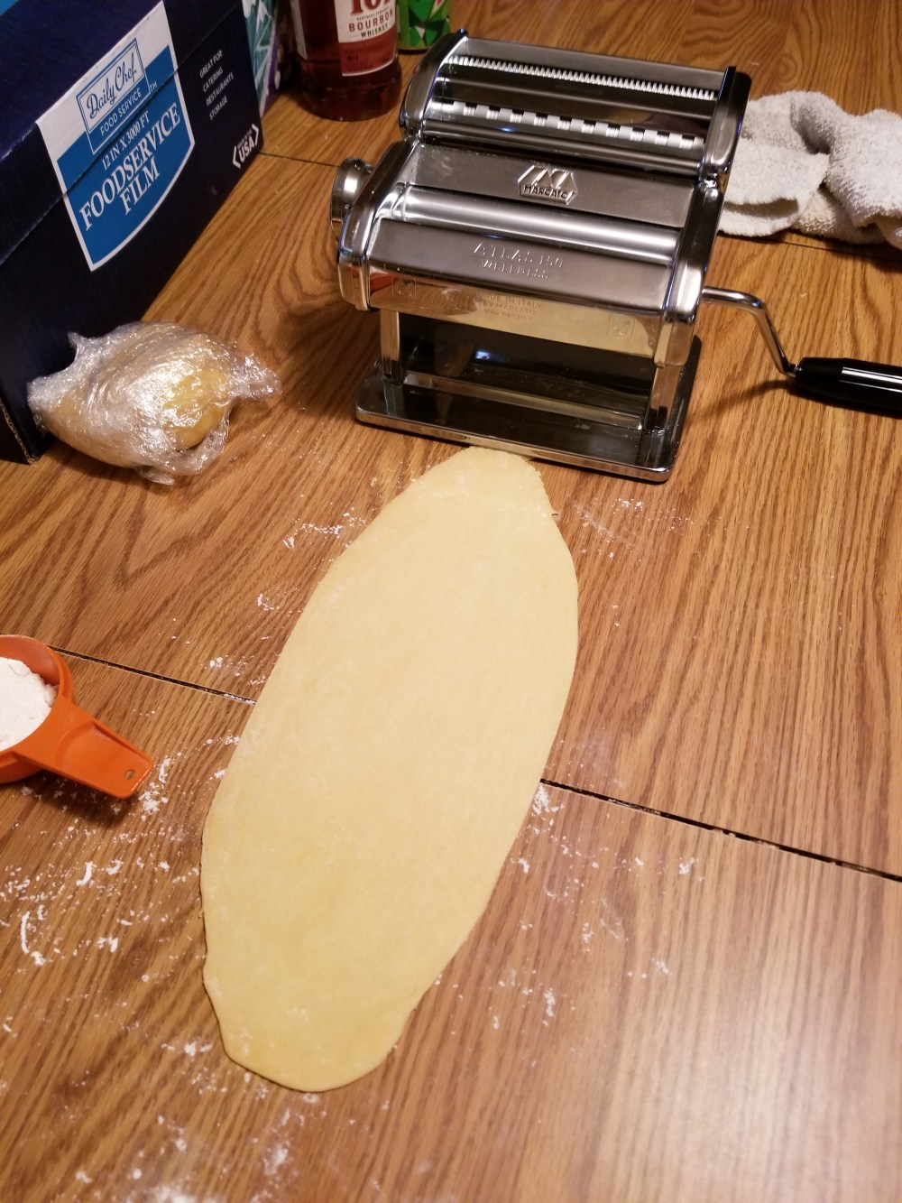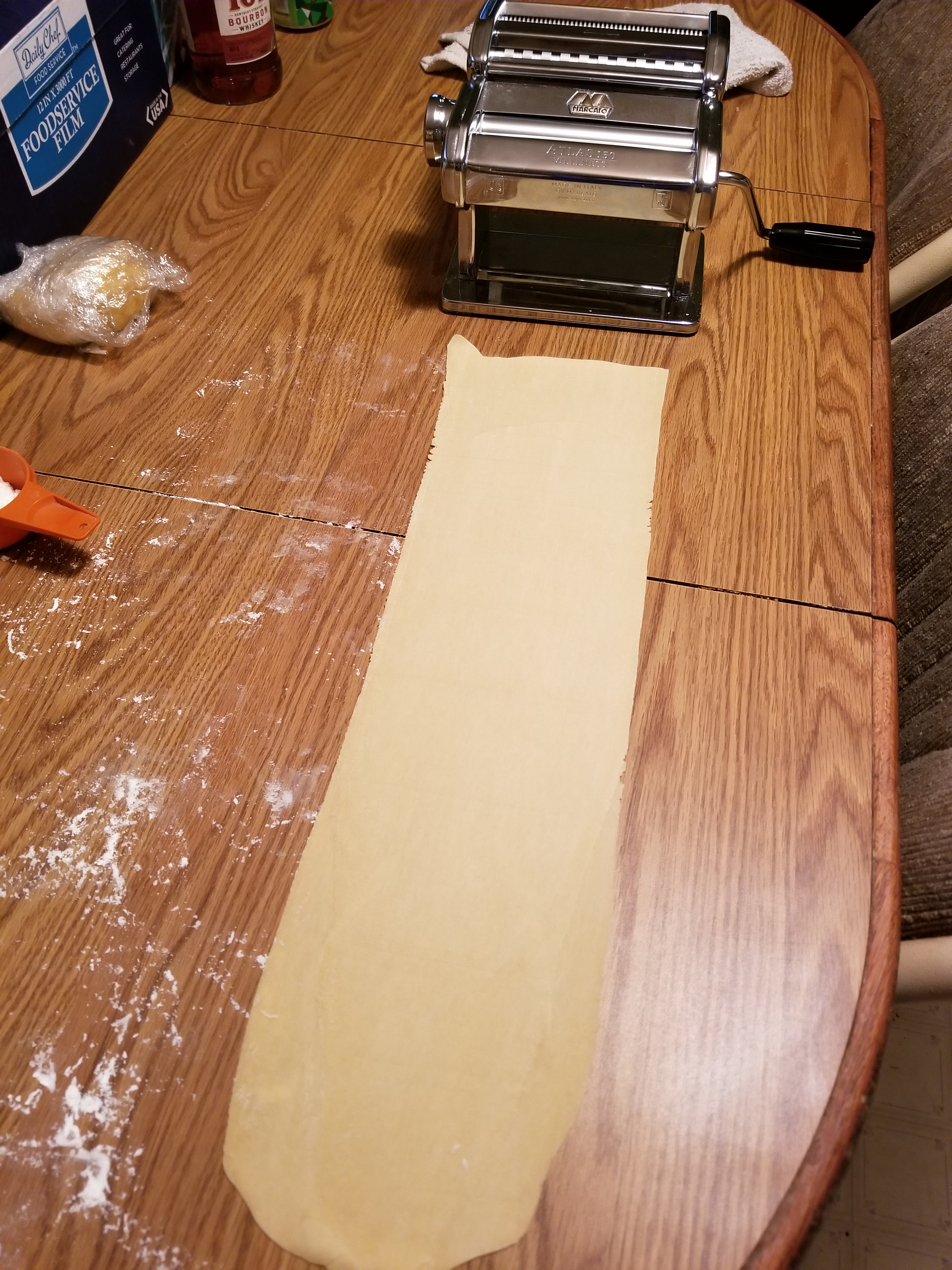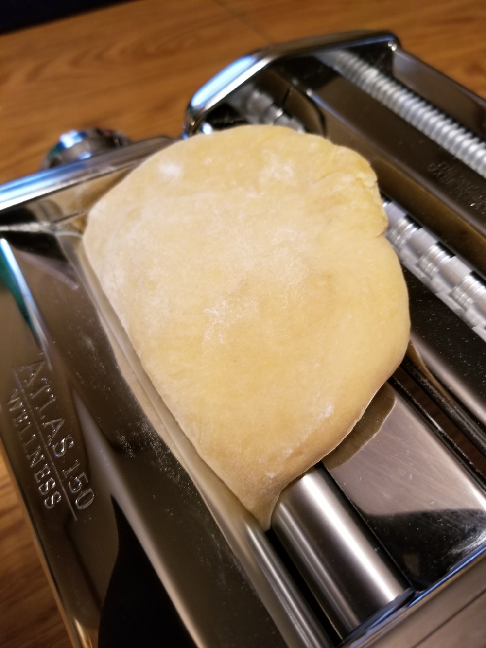 now set your pasta machine to the thickest setting and run da dough puck thru a few times on each setting til u get to the second to last setting. anymore than that n the dough will be to thin to hold da filling without bustin open