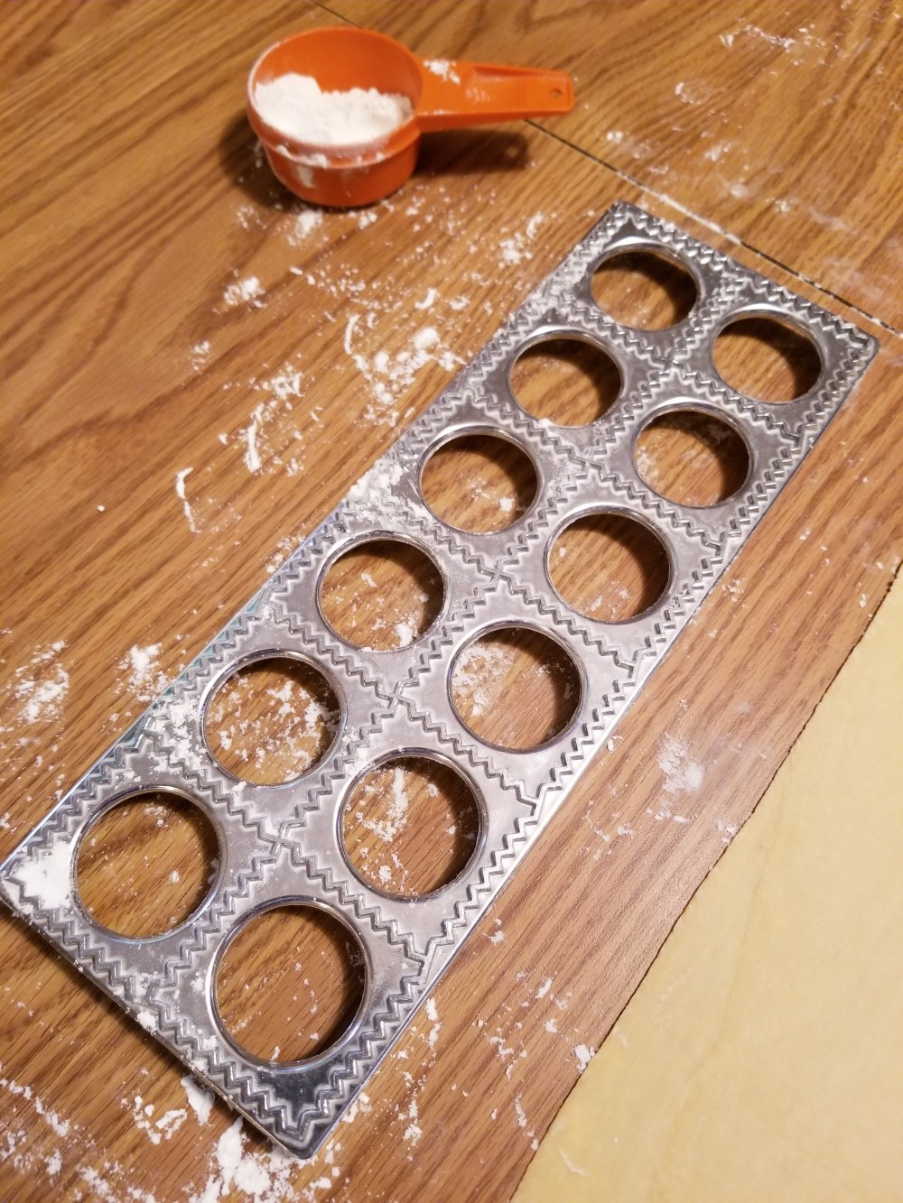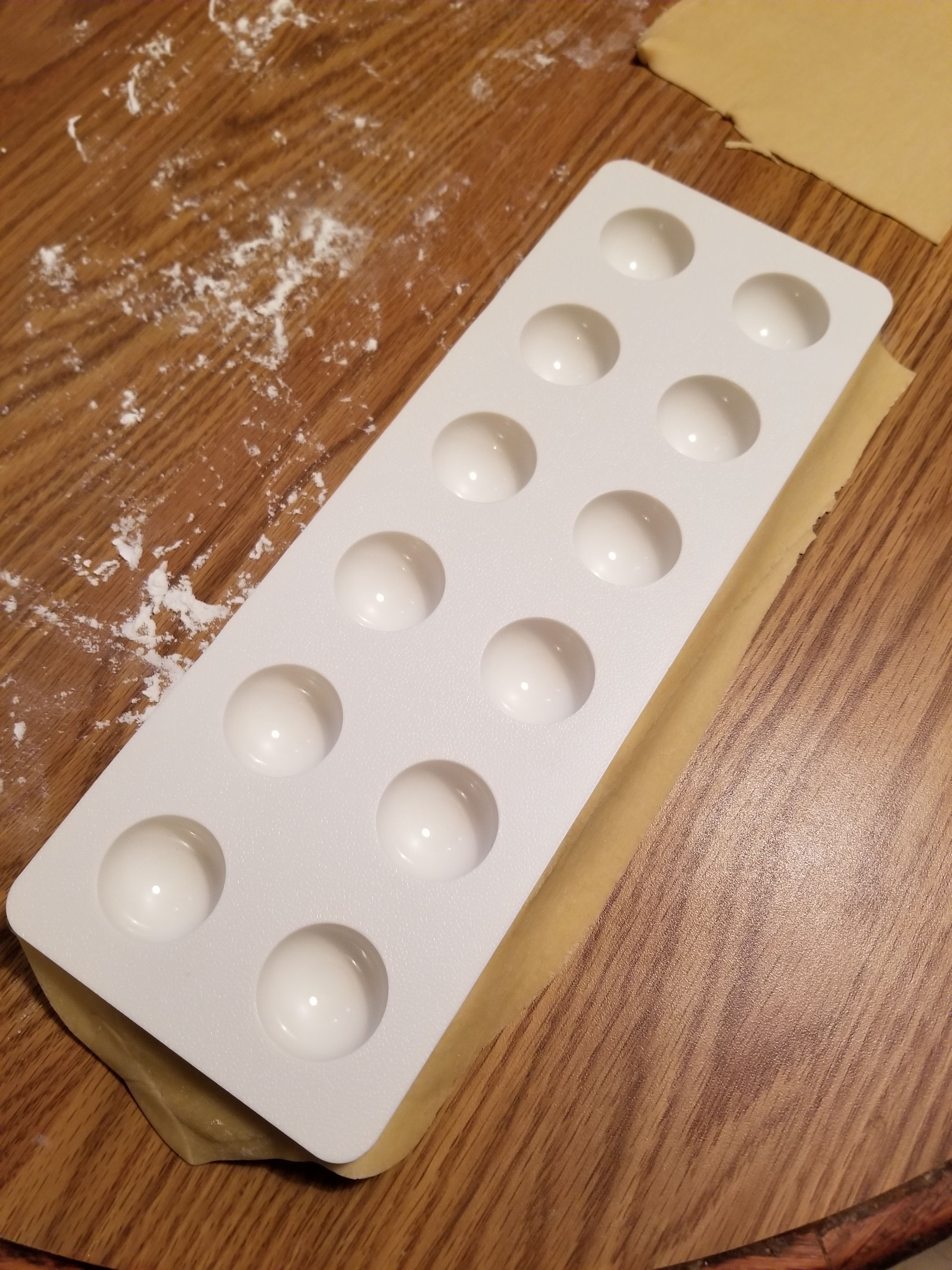 n flip it over n slowly n carefully remove da whole sheet of raviolis from da ice cube tray thingy