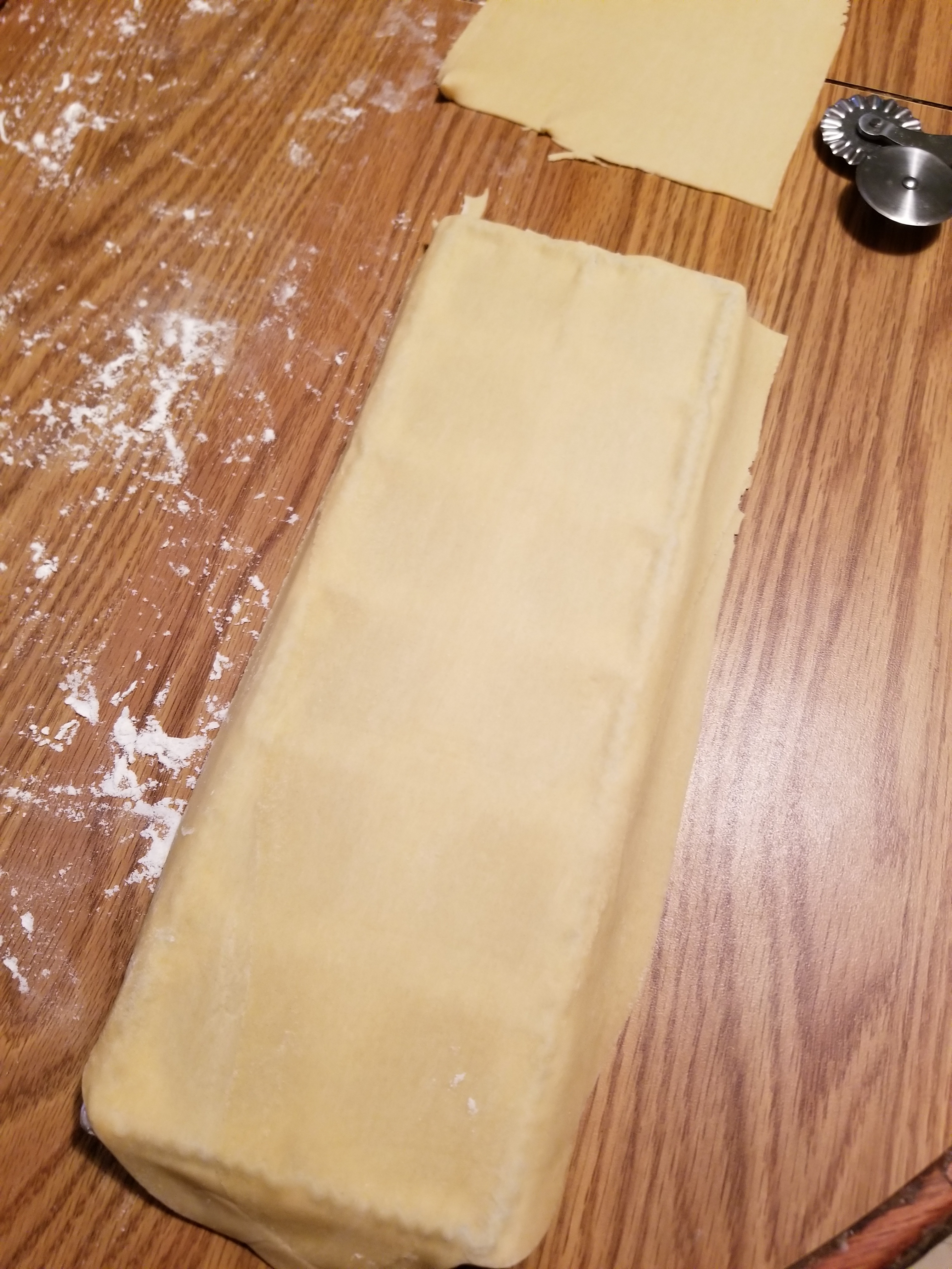 now lay down another blanket of pasta and using a rollin pin seal n smooth it off