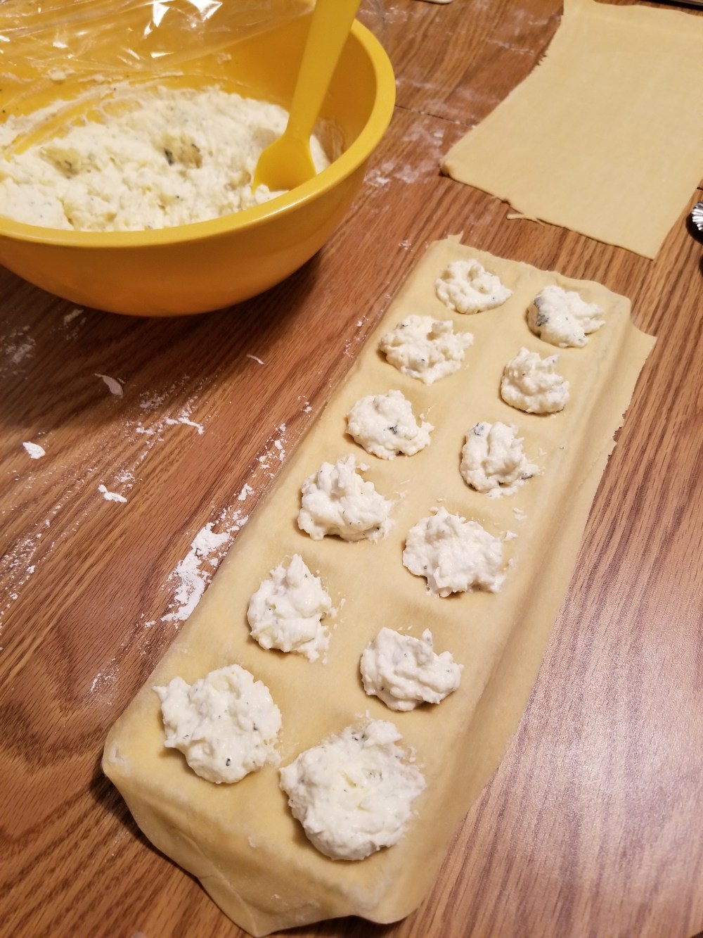 now if u got a ravioli former thingy. break it out n rub yo floury hands on it so da dough dont stick to it cauz it will lol n get to assemblin