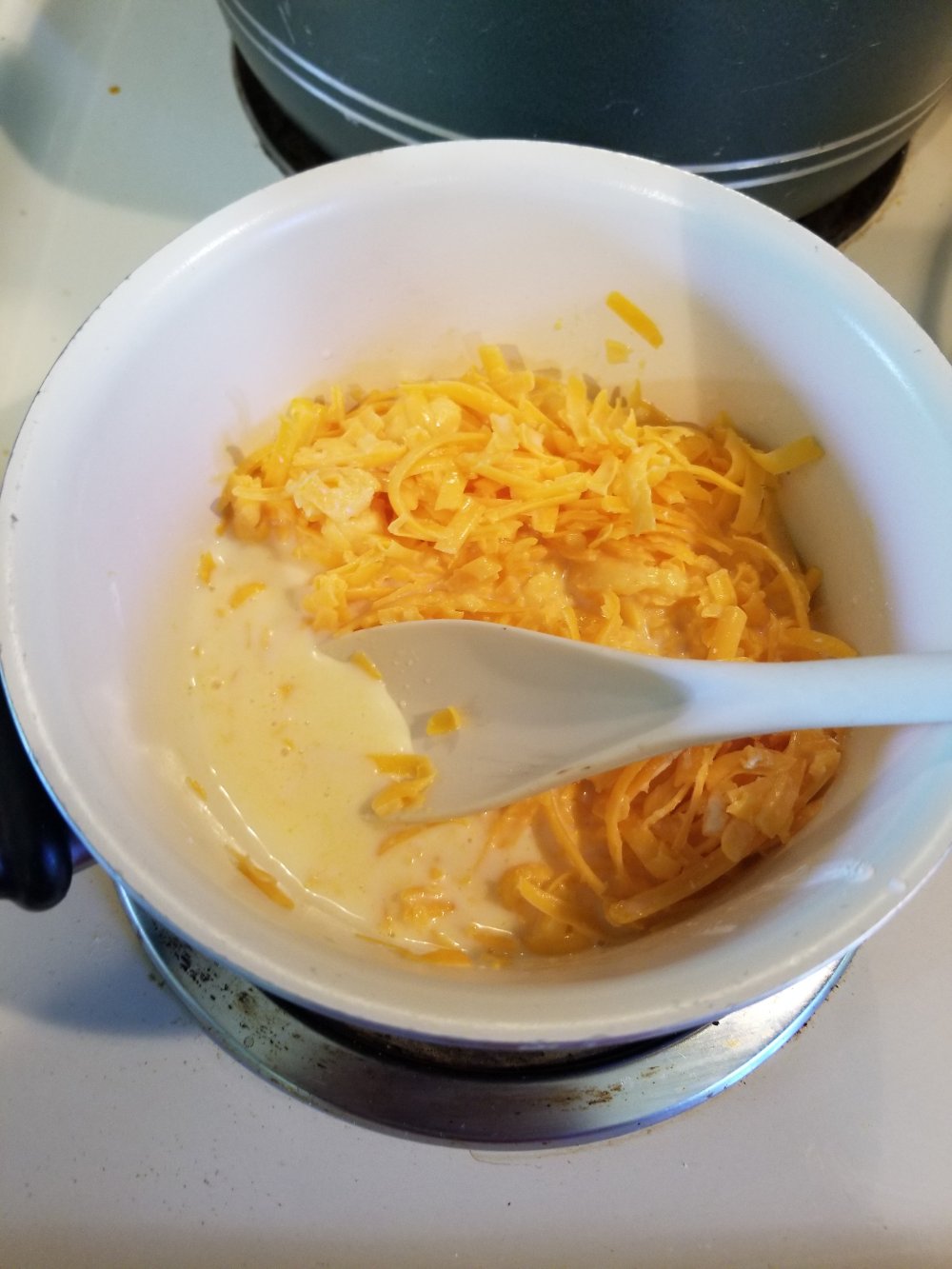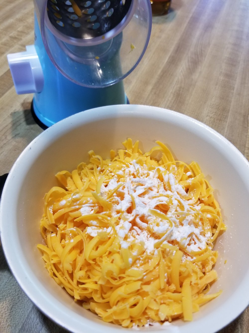 one more thing to do. da cheese sauce. so add yo cheeses n corn starch to a pot. n best to shred yo own cheese cuz it melts way better. weve gone over this before im sure lol