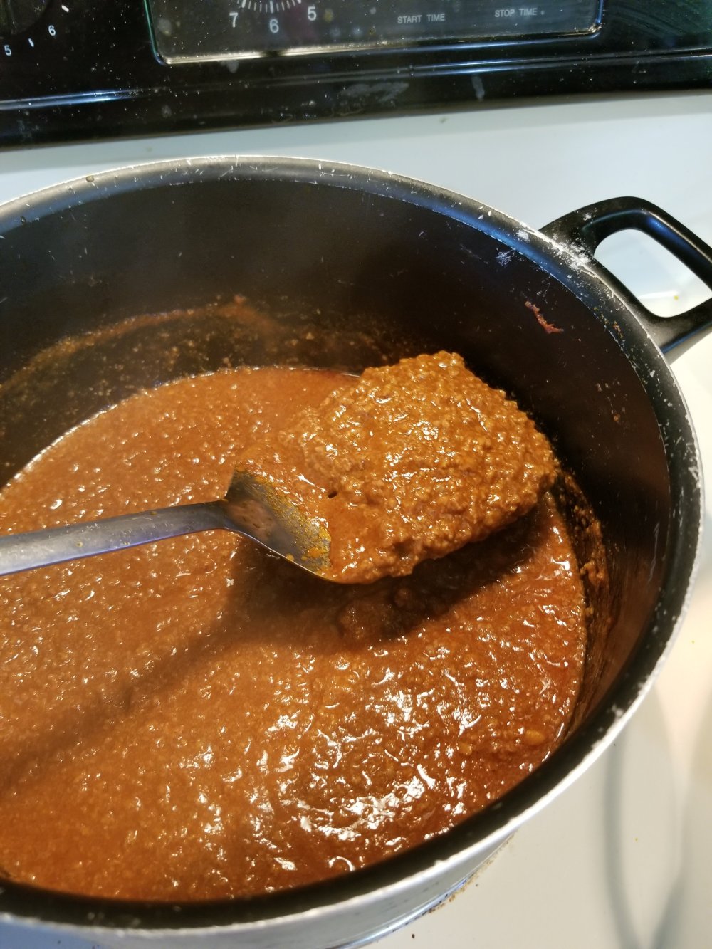k now add the tomatoe paste n the dry ingredients n let it simmer for bout a hour till it reduces most of the liquids out n stir n break it up every so often