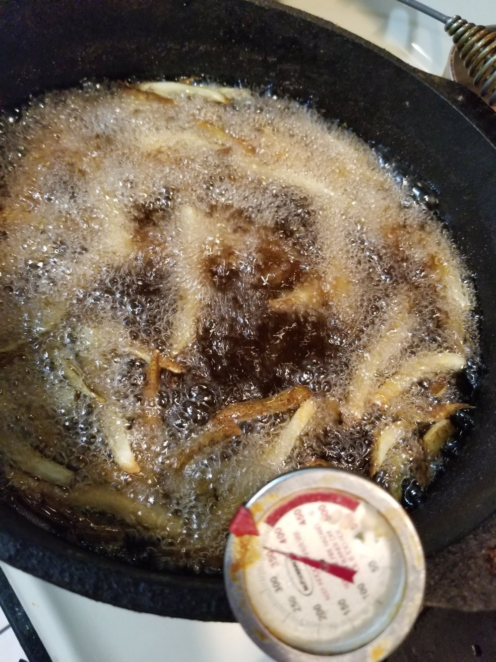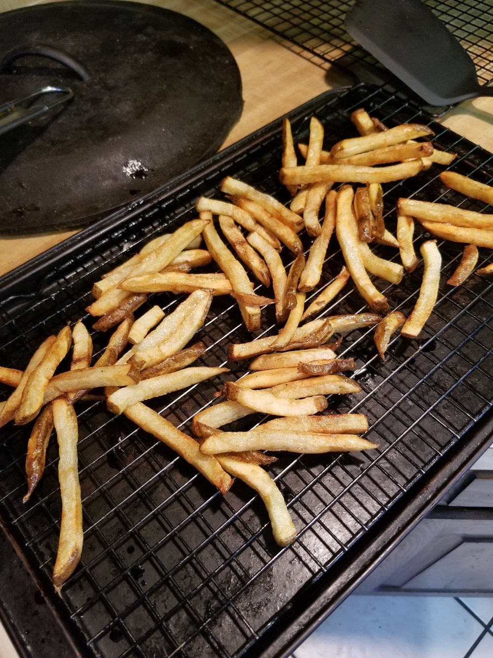 k after they come out da oven drop em in your oil at 375ยฐ for boot 3 min or till oil temp drops to 300ยฐ then pull em out n let oil get back up to 375ยฐ n drop em back in for another 3 min n pull em again n let em rest on a rack to drain n hit em wit sum salt. by fryin em low n high we get that crispy outside n creamy inside i know its tedious af but so worth it n u can forgo the oven step n just fry em at 350ยฐ for 8 min then rest 20 n fry at 375ยฐ for 3 to 4. up to u