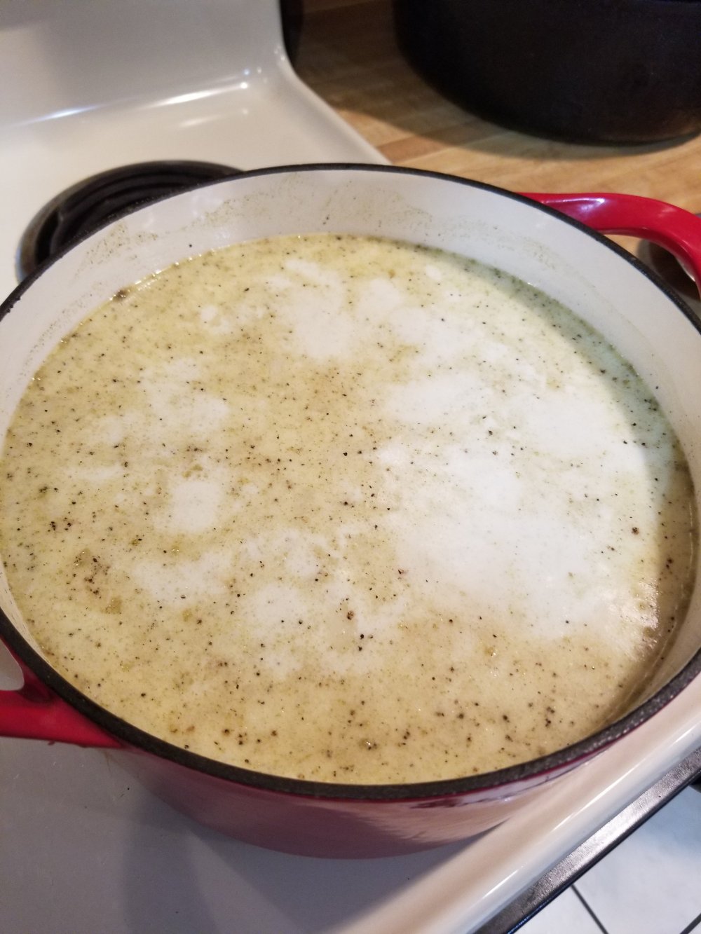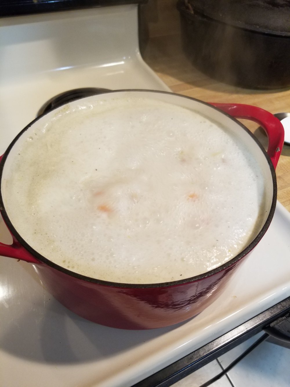 now add the stock mix back to da pot with the veggies n add the milk n cream n seasonings n chicken n bring to a boil for 25 min. stiring ever couple min or so