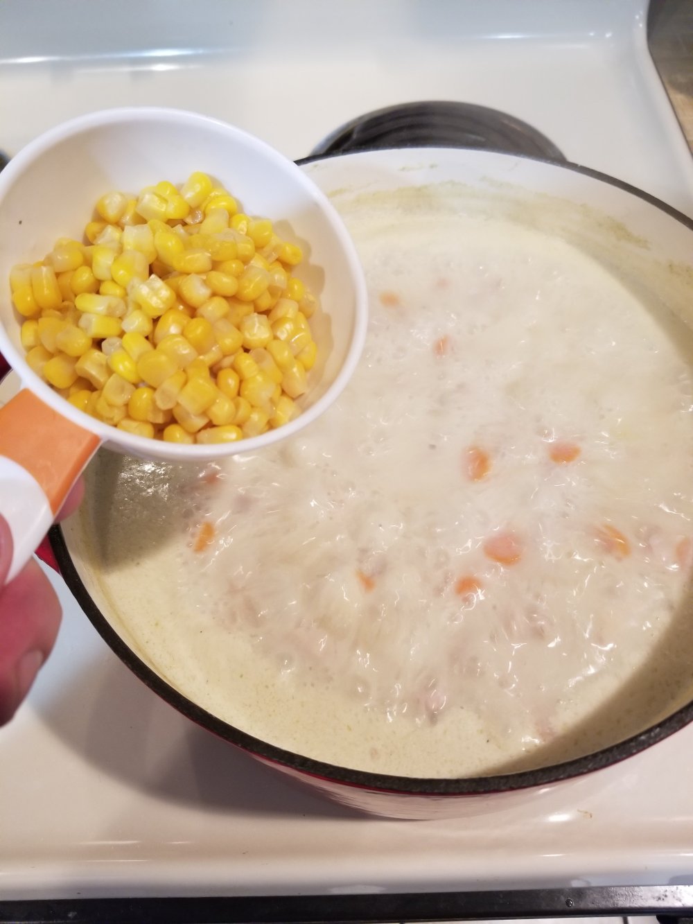 k stir it in til its melted n smooth then add yo 2 cups of corn n 5 strips of crumbled bacon n parsley