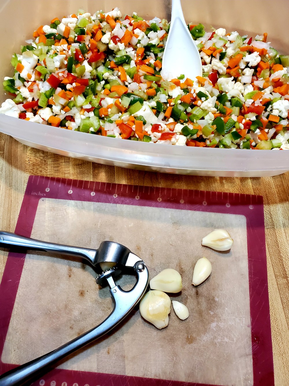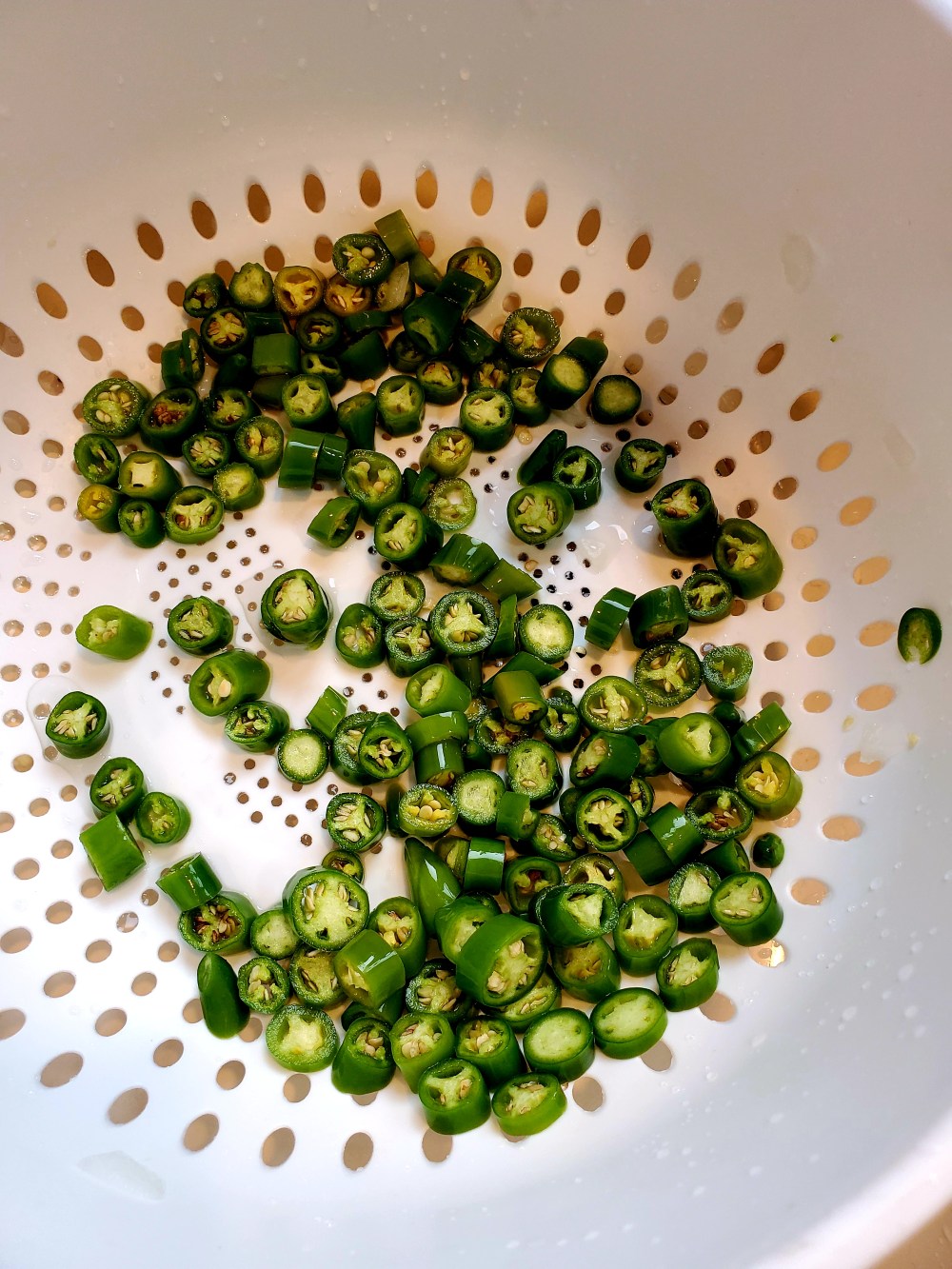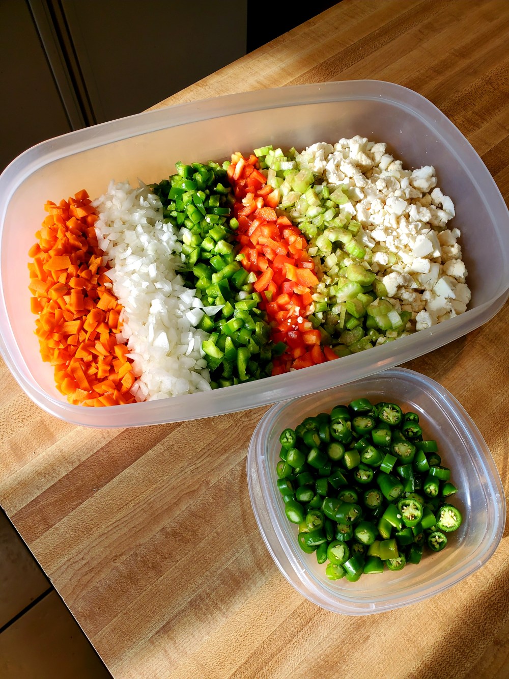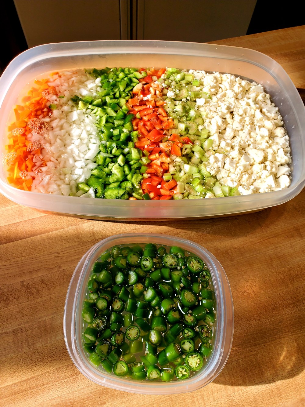 first we need to dice up all da veggies except da garlic and olives into small chunks. not to small but not so big they fall of yo sammichs lol. n keep da serranos seperate so we can make a mild version too. not that it should be a thing lolπ