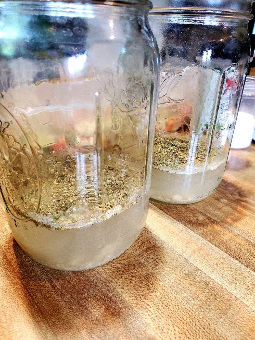 now that the brine has been washed off its time to grab a few quart sized mason jars n add enough vinegar to fill it up 1/3 of da way n add a good amount of salt italian seasoning a little mustard powder and 1.ts lemon juice n stir it up.