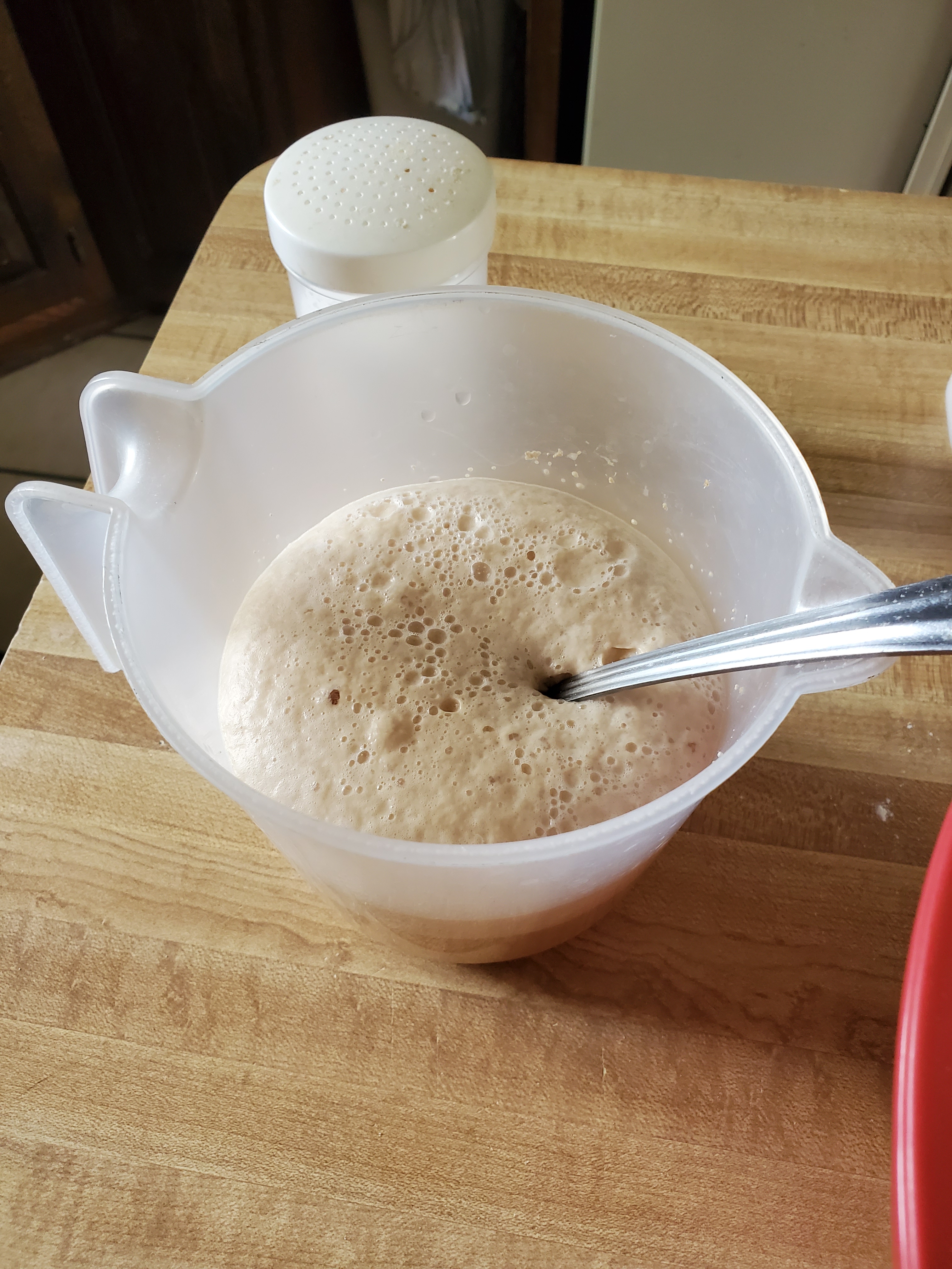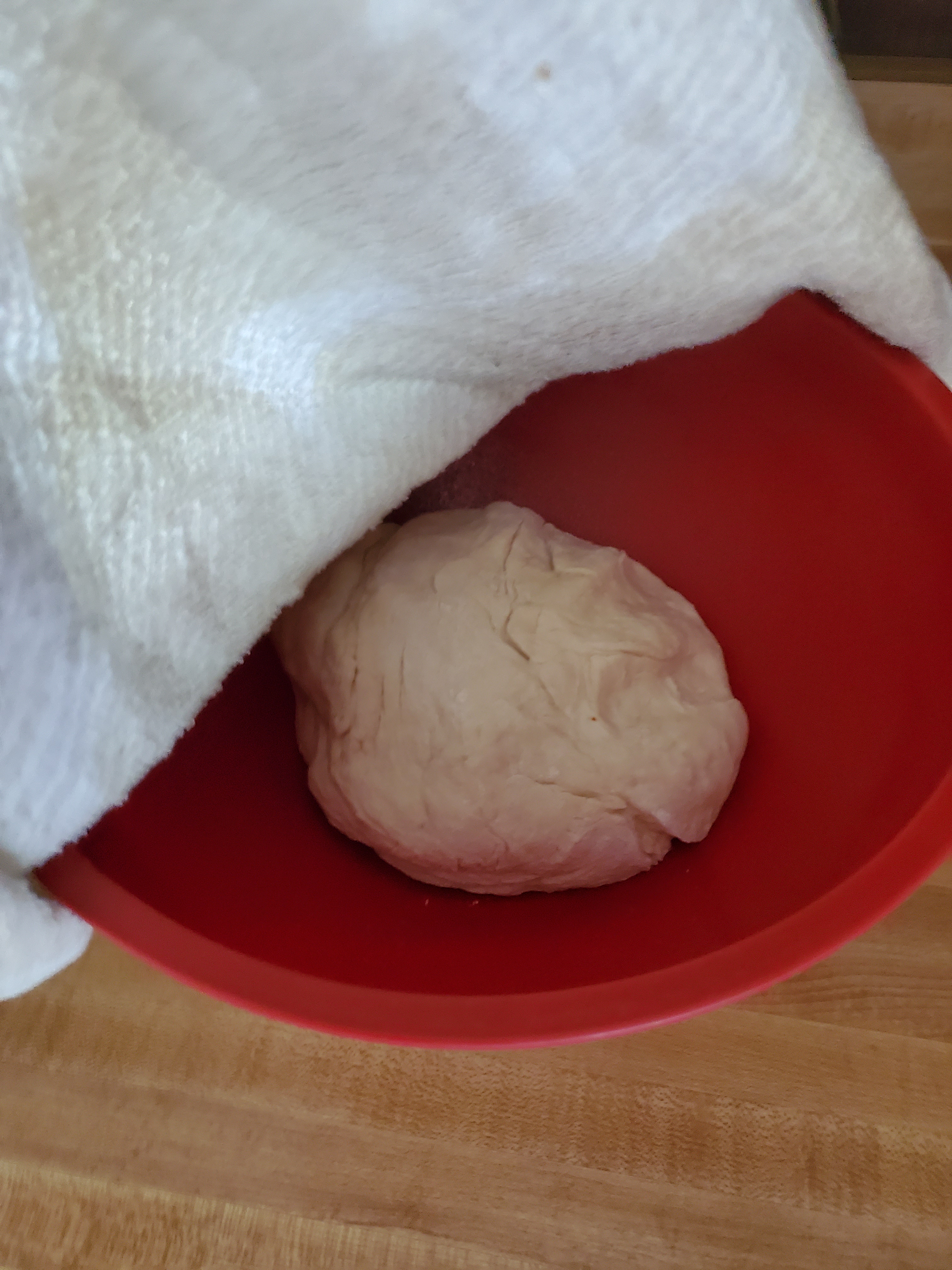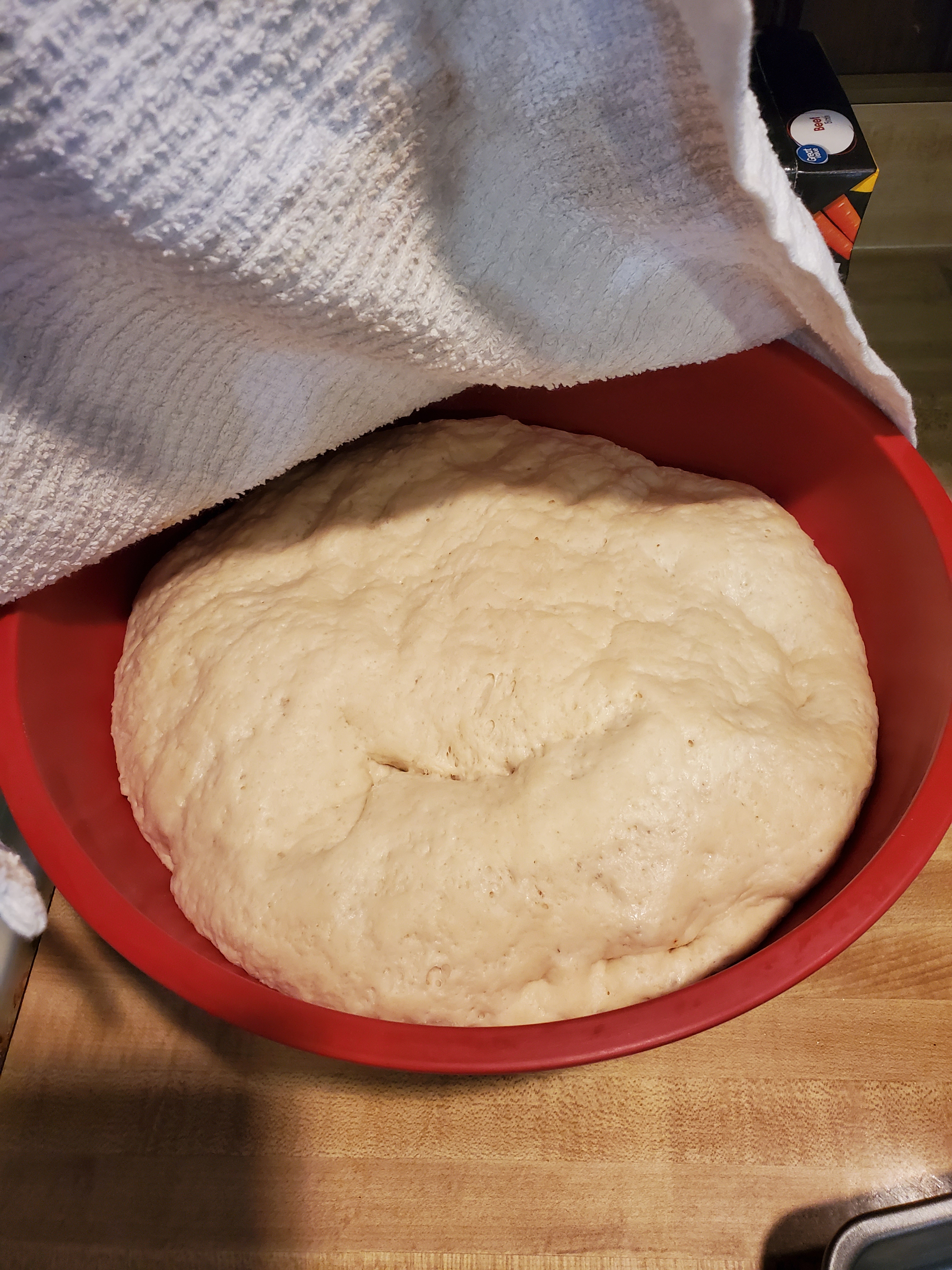 nice. now punch it down n give it boot 30 more min then well drop it out to a lightly floured surface n divid it into 3 equal ish. pieces