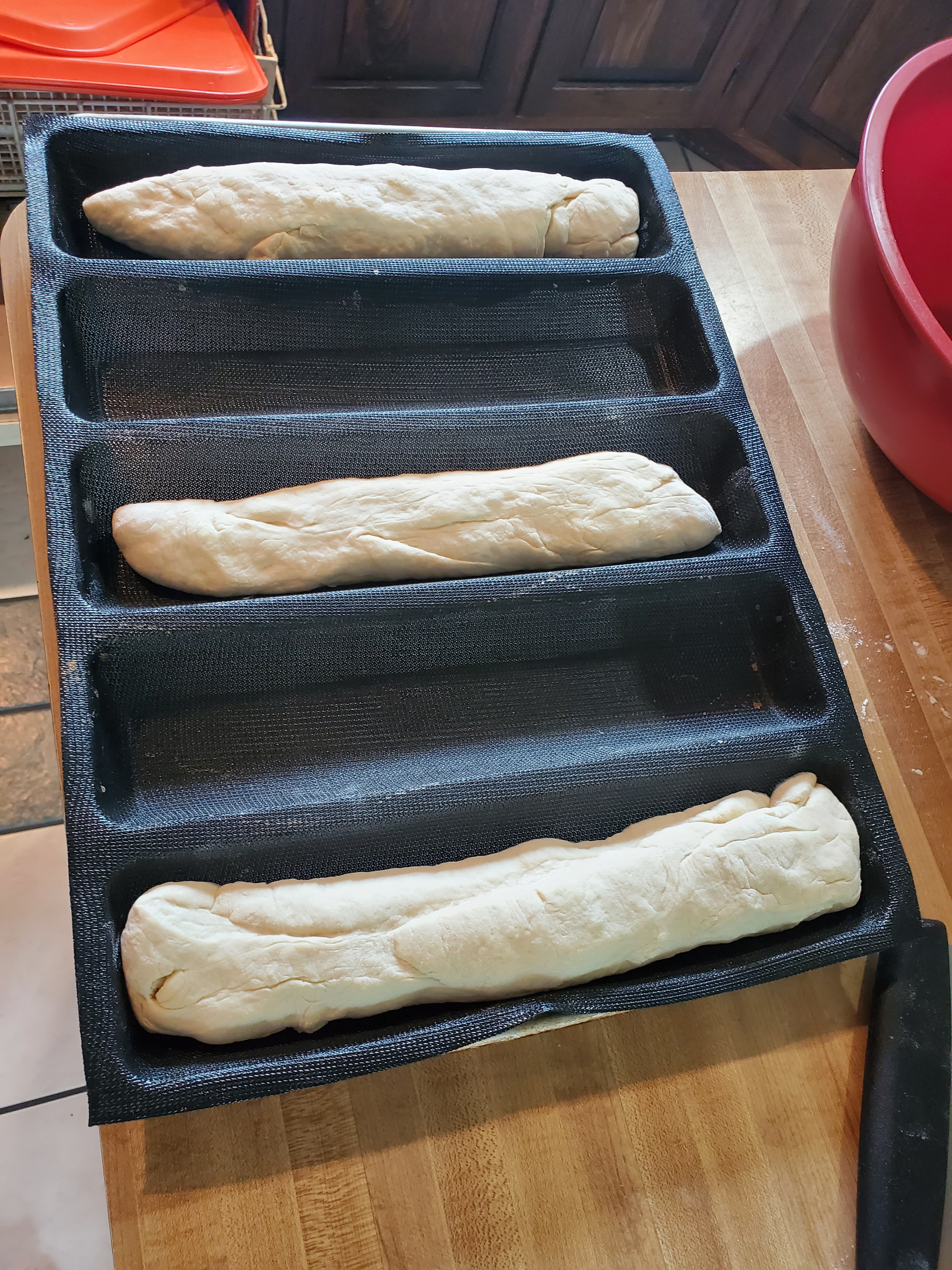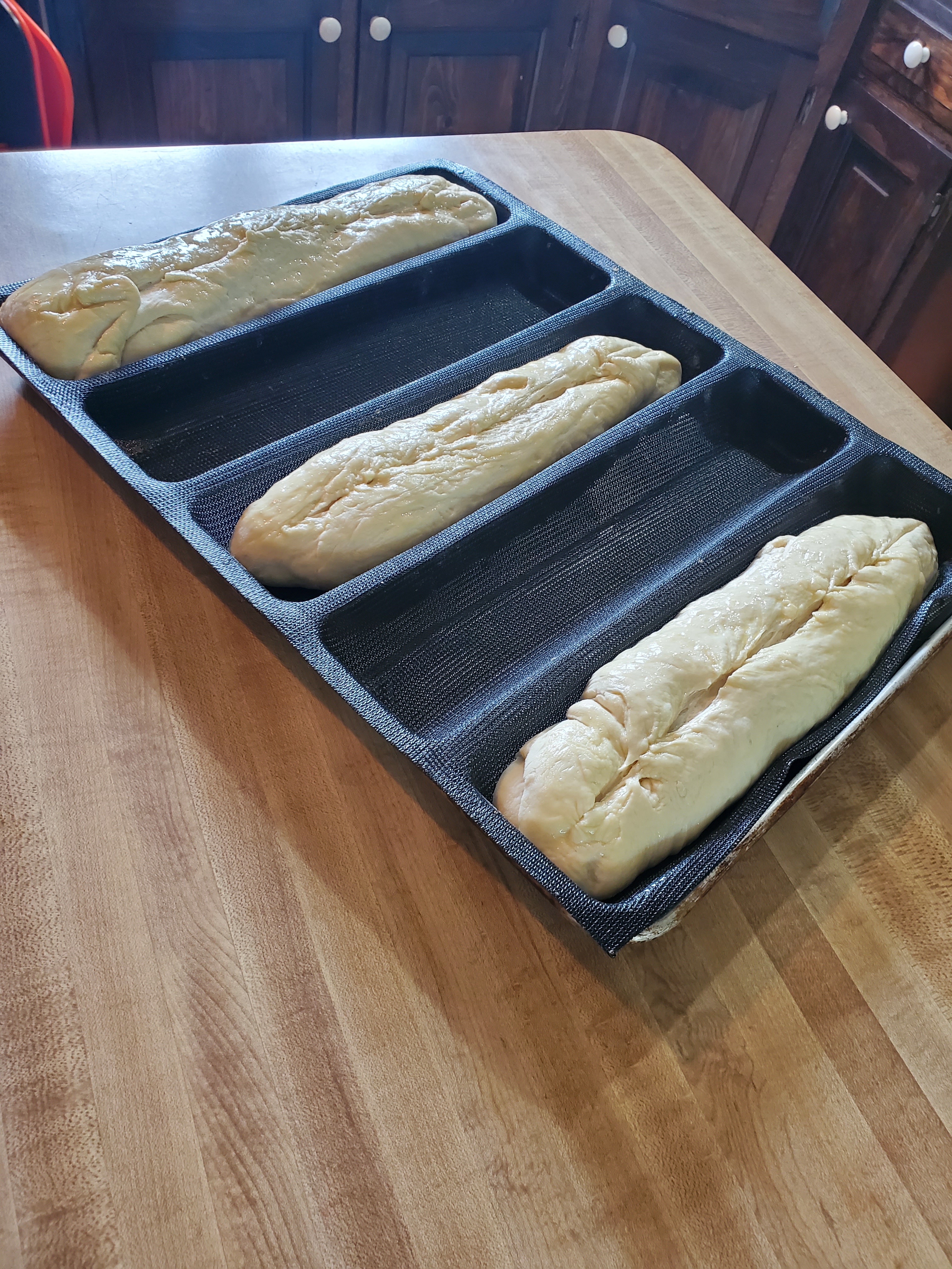 now well roll em out by hand n form 3 loafs n u can place em on parchment paper on a pan or i like these bread molds for makin these. up to u
