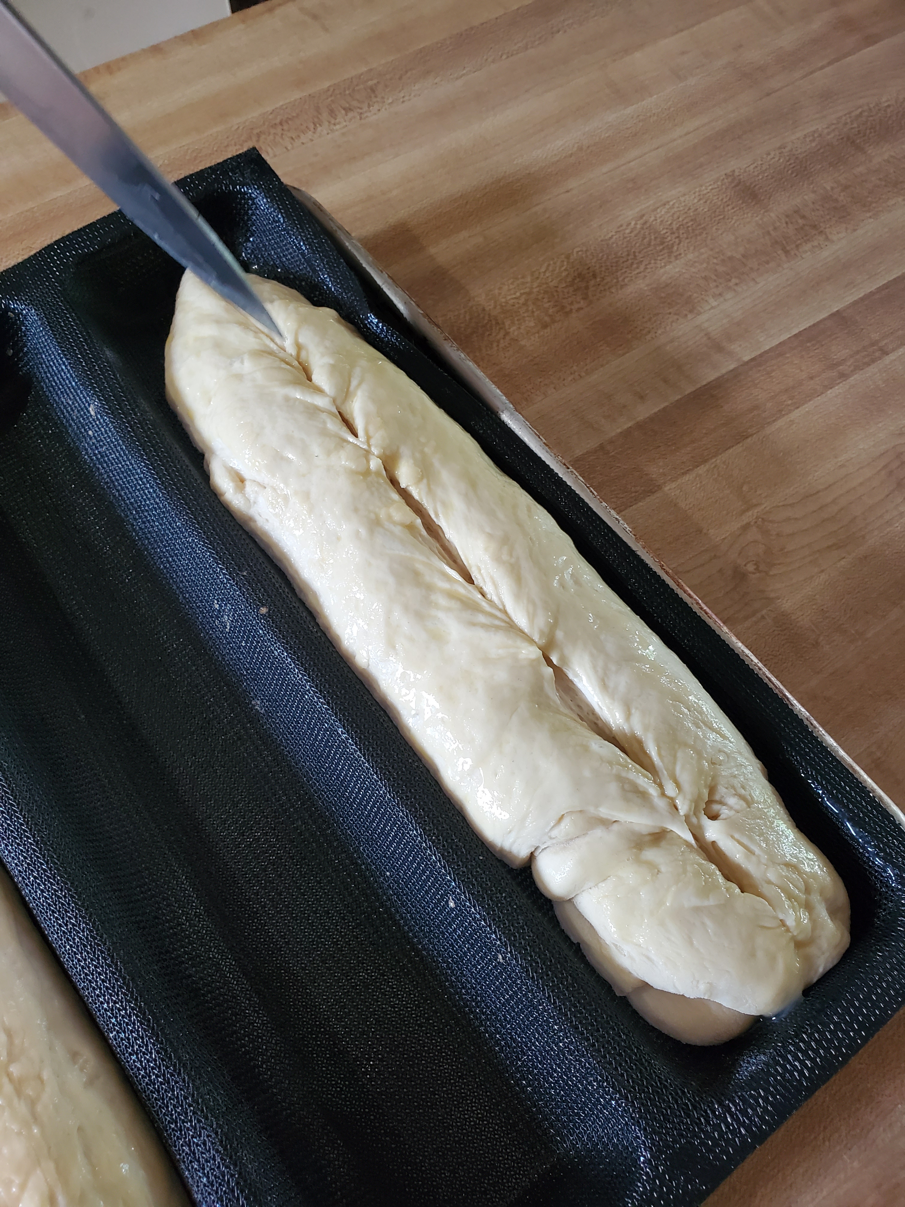 after that run a small slit length wise. called scorin it makes it look cool after it cooks n probably helps wit bakin. idk. im not a scientist. or even spell guud🙃( update. score bread before the last rest. my bad. if it rest n u score it itll deflate but not da end of da world )
