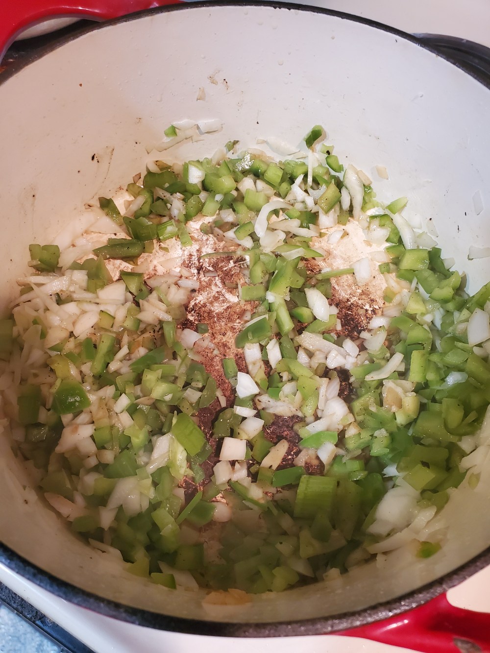 after its browned up remove sausage but leave the grease n da pot. thats the good stuff lol n. put a little more oil n and drop n yo diced onion celery n green pepper n cook til tender bout 6 min or so then then add the minced garlic n cook one more min. garlic burns fast😶