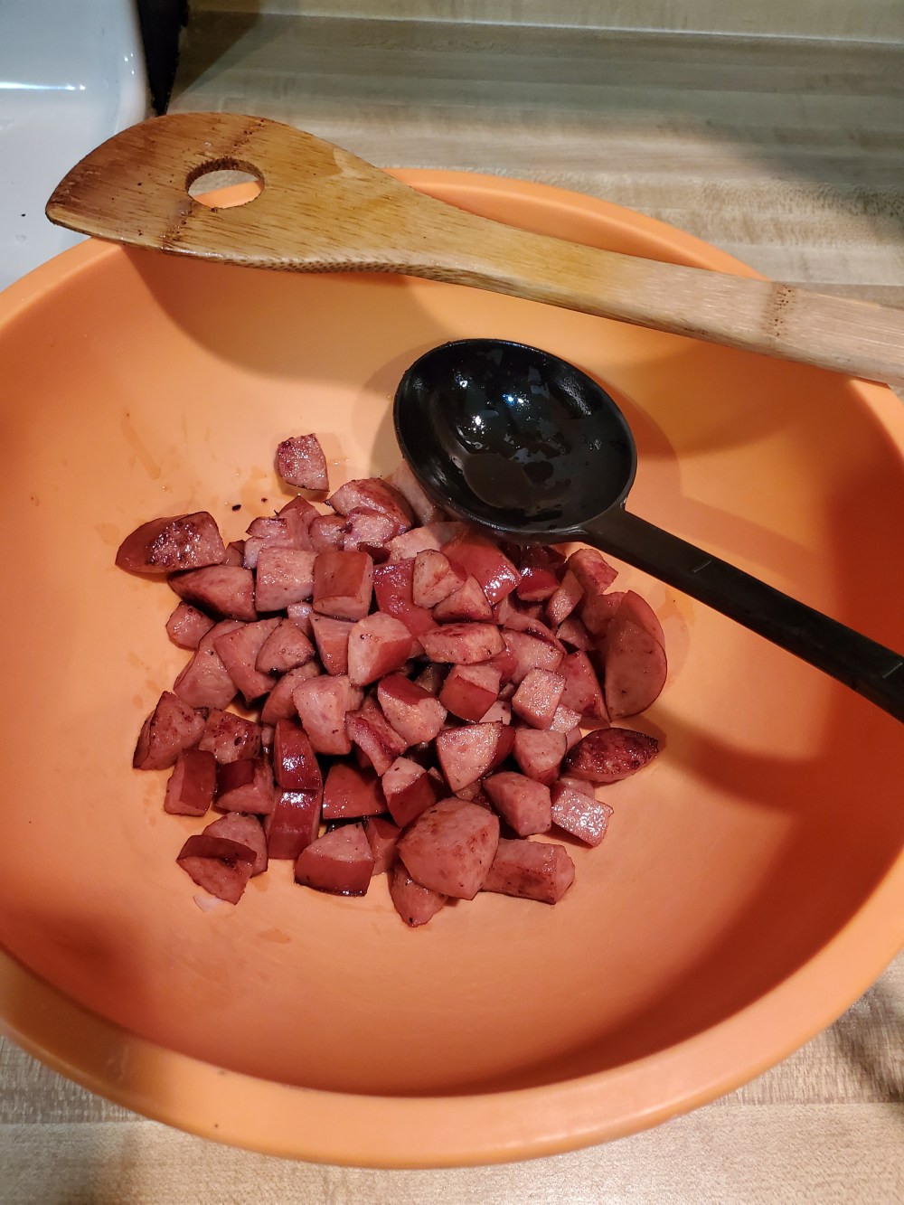 while thats poachin away well take a big ceramic dutch oven n put the olive oil in and dice up the sausage and get to browning that meat up sum on med heat