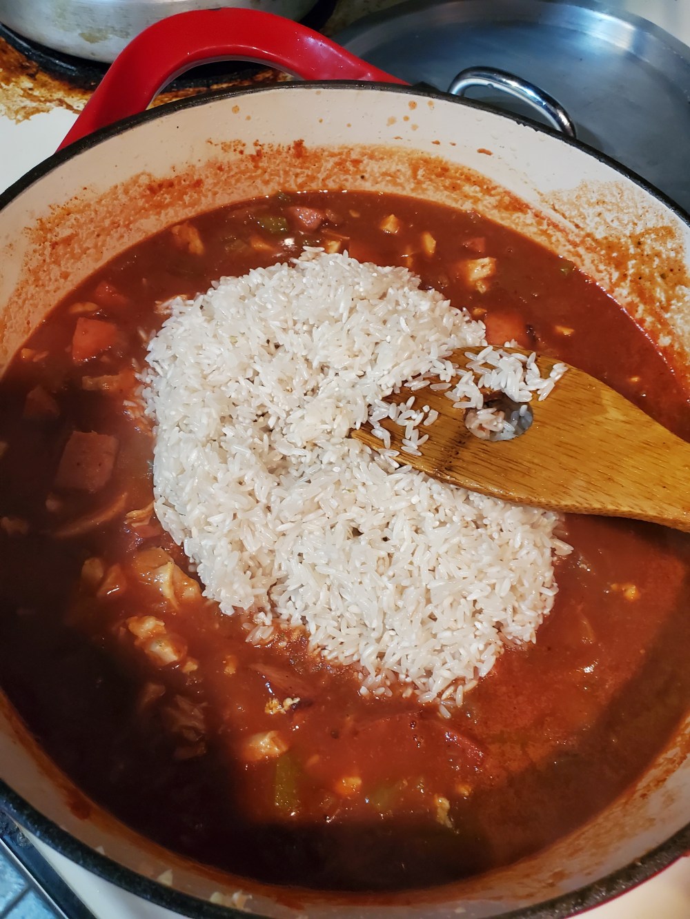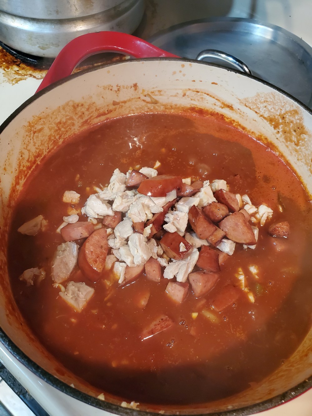 k. after it boils for a min. reduce heat to simmer while u chop up yo chicken n rinse off yo rice lol. then add your chicken n sausage back to da pot n bring back to a boil and as soon as it boils turn heat off n put rice n stir real good put lid on and place in oven at 325° for 40 min