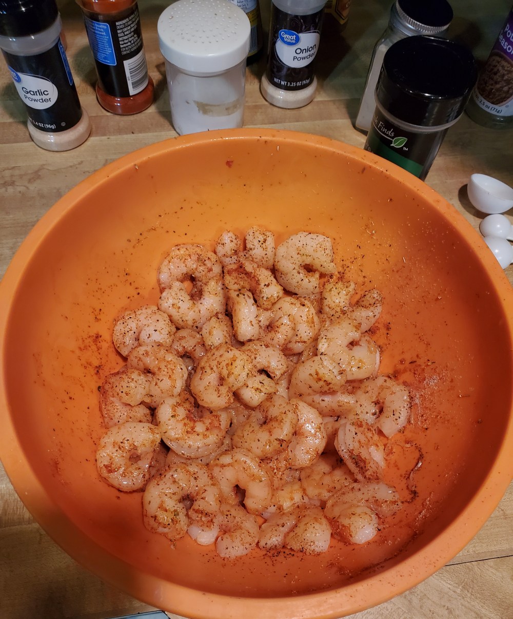 while thats cookin. we can get on da skrimps lol. just need to grab a pan n put a bit of olive oil on it and drop the shrimps in after u season em wit salt. pepper. onion n garlic powder. paprika n cayanne if ya want some kick. id go wit slap yo mamma but yall babys round here. lol. jk. but ya. we just heatin up some cuz i buy the pre cooked ones. so we just gettin the seasonin set in on em. cook bout 5 min. med heat. dont want em mushy or we would of cooked em in da pot. the skrimps go in last so they keep that good texture