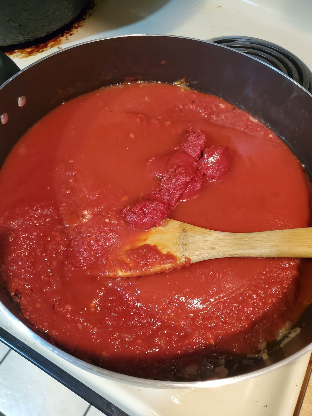 then add yo paste , tomatoes , seasonings and sugar n bring to a low boil n reduce heat to low n simmer for least a hour til its thickend up we want a thick sauce so it stays on top the chicken breading n not try n soak into it lol