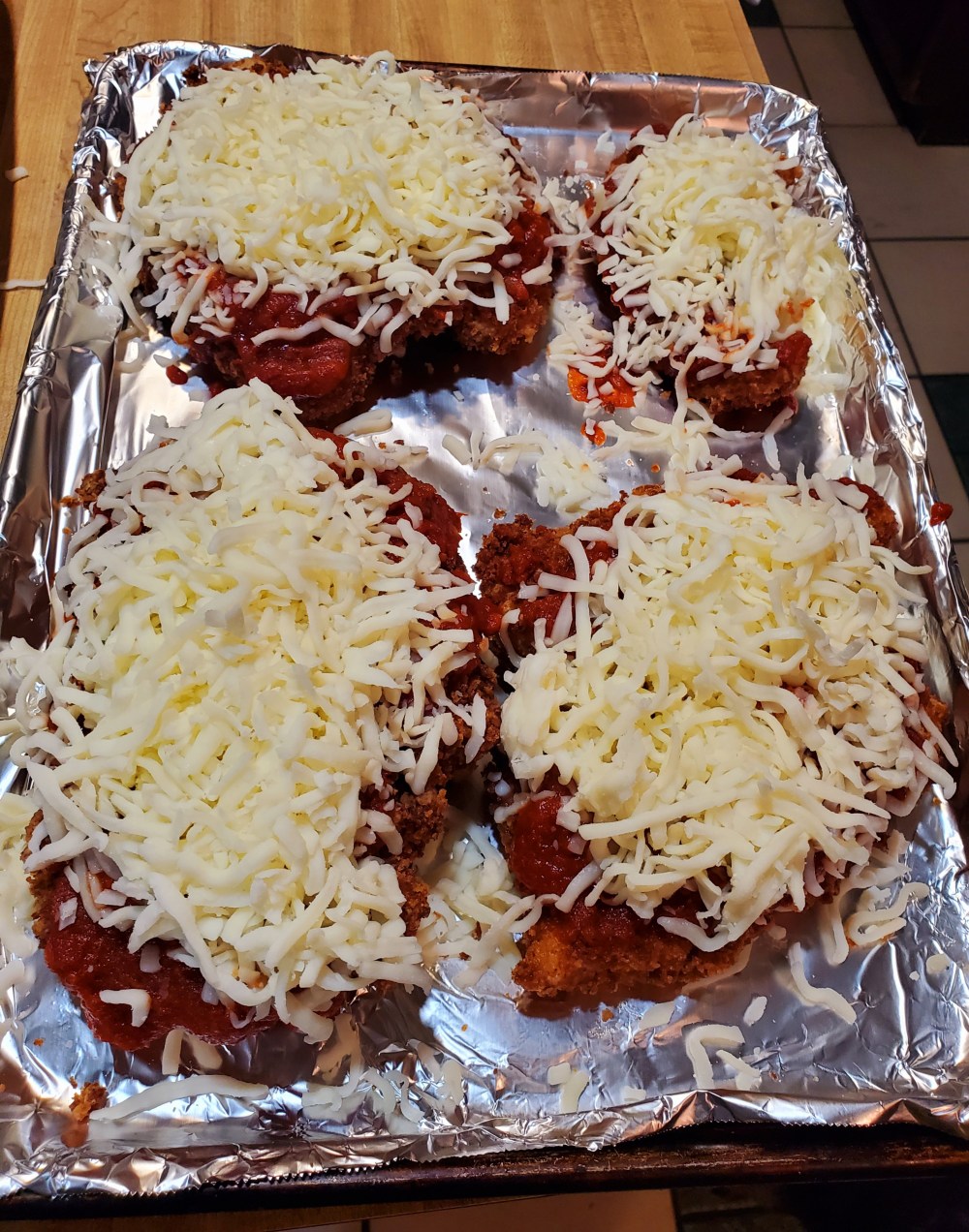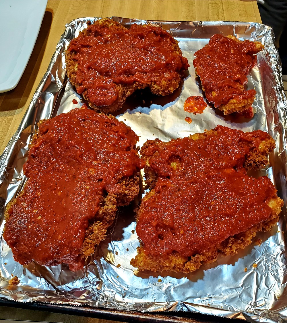 after u got em flat n trimmed. place em in a bowl n fill it wit enough water to cover em n give the water a few good shakes of salt to help brine da burds up before we fry em which brings us to our next step. gettin oil hot n breading stations ready lol. so grab 3 big bowls or pans. n place flour in one. 5 or 6 eggs whisked up wit bout a few splashes of milk and last bowl put your panko wit a bunch of fresh parm in wit it. lol n season up your flower also wit salt,pepper,italian seasoning, onion and garlic powder ect… what eva u want lol