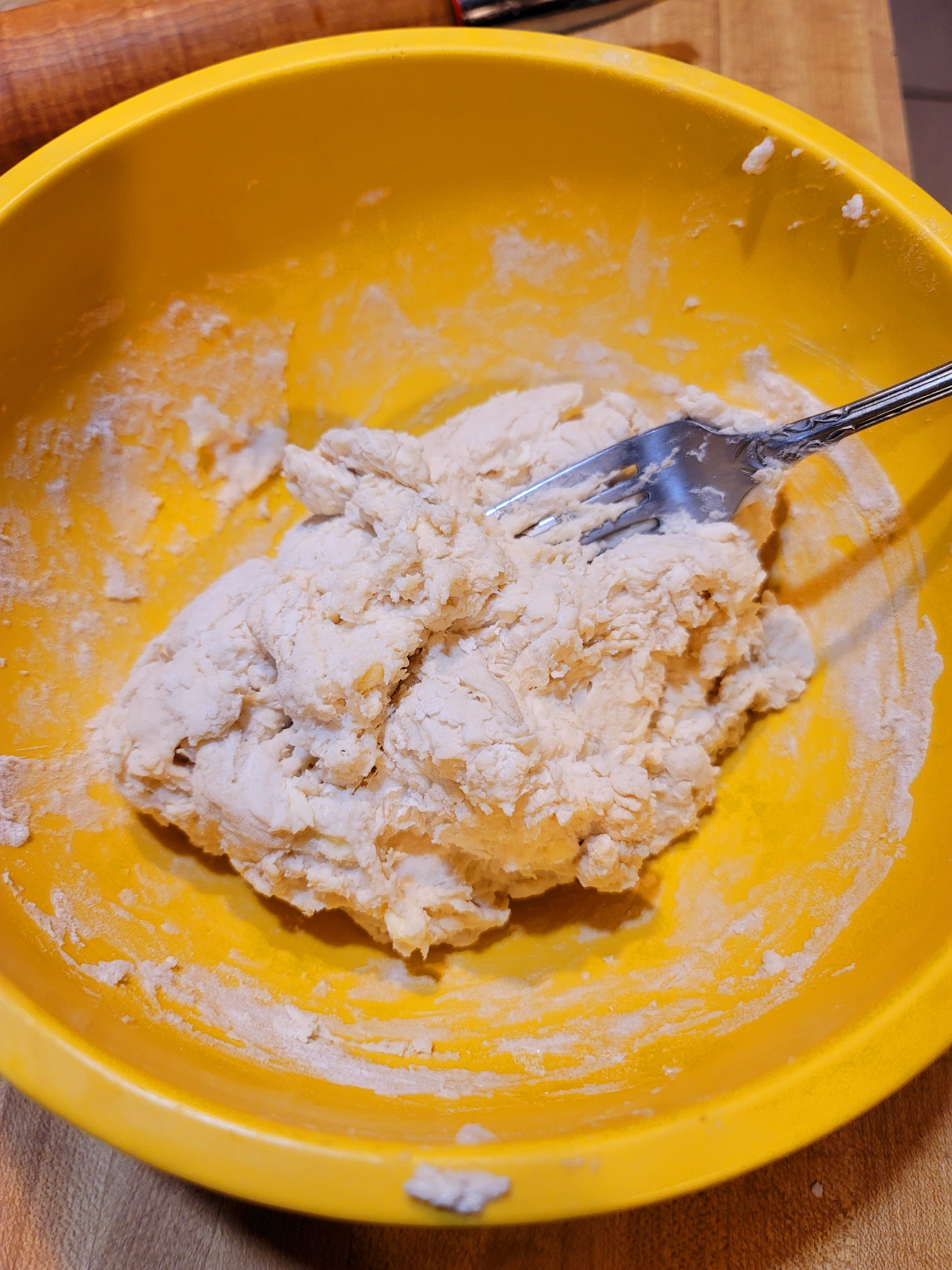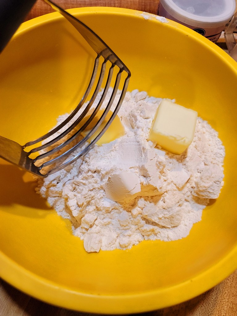 k now that the soups ready for da dumplins lets get on then rite quik. take your flour n put it in a big bowl n add yo butter n really stir in in guud with a pastery shifter or fork till its mixed then add the baking powder, salt then yo milk n combined til u get a nice dough ball n it should be a bit sticky but not to much