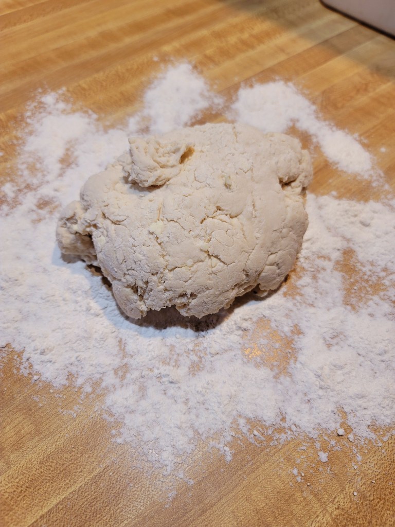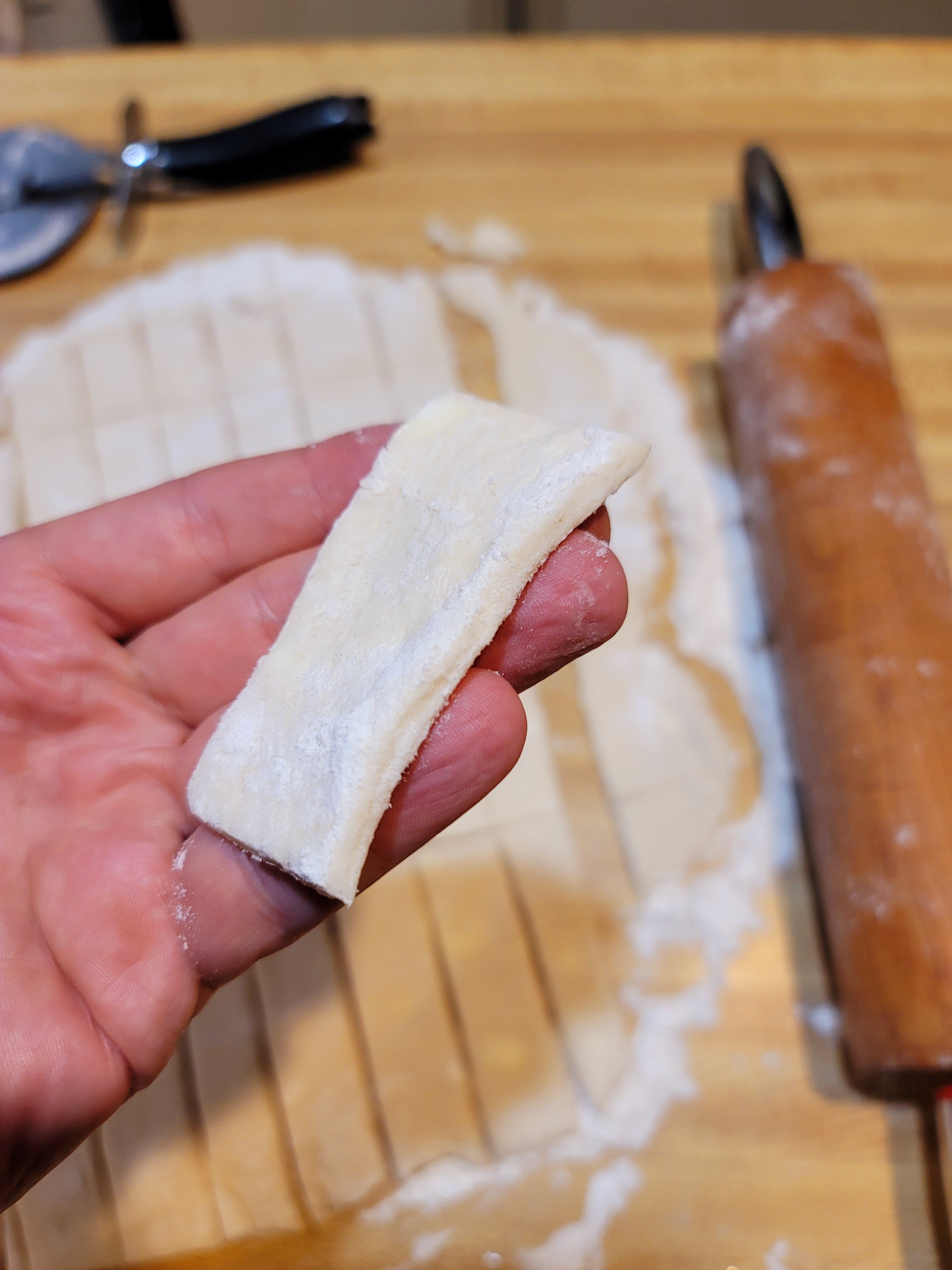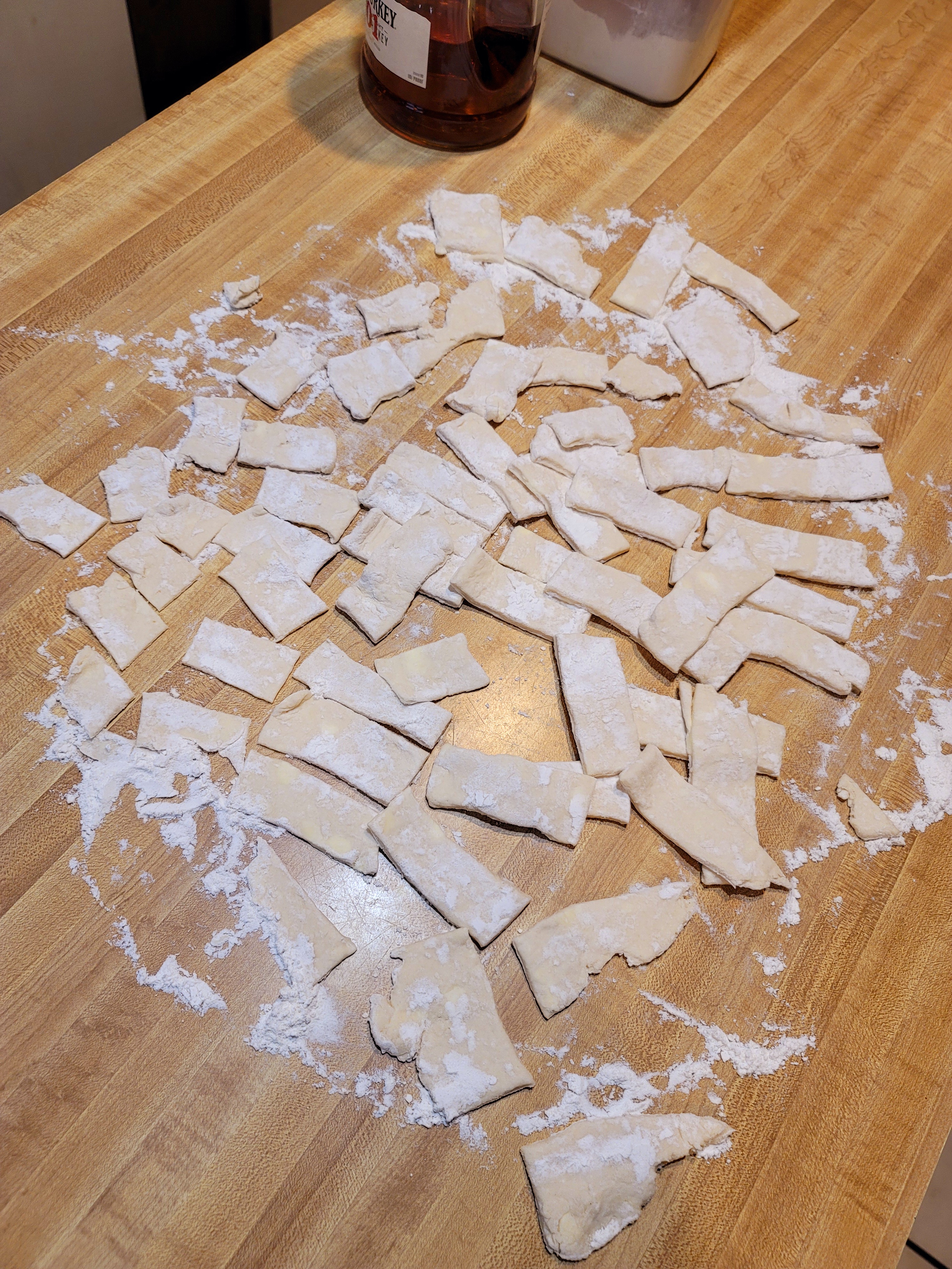 k then well drop it on a heavly floured surface n dust it guud wit flour n roll it out thin. like 1/4 inch thick or so then cut em into strips like fat noodles bout inch wide n 3inch long or so then coat both sides in flour so they dont stick to shit lol