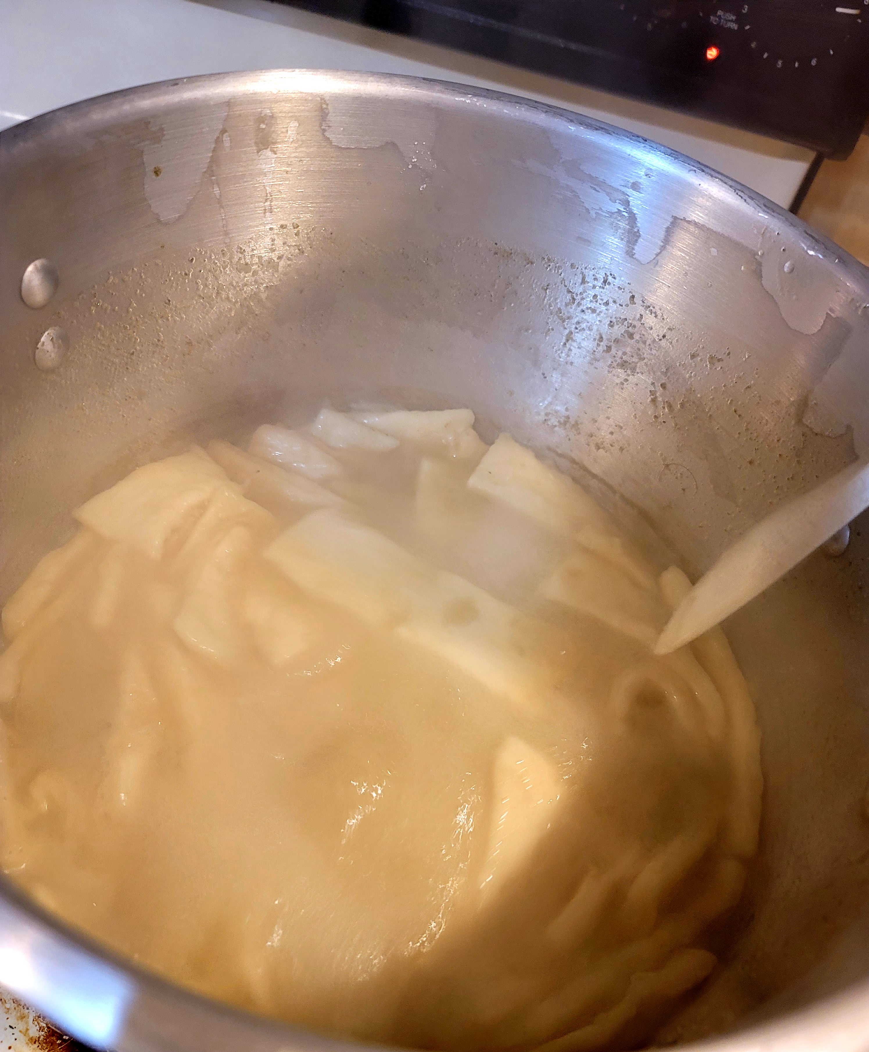 i like to make the dumpings like this cuz they kinda look n feel like doodles but u can also just drop small spoonfulls of the dough n for drop dumplins n cover pot for first 10min of boiling less work too lol
