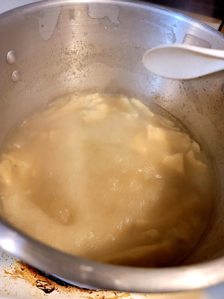 now well bring our soup up to a boil and drop all them dumplins in n boil for 20 min uncovered stirring every 4 to 5 min or so to keep em loose
